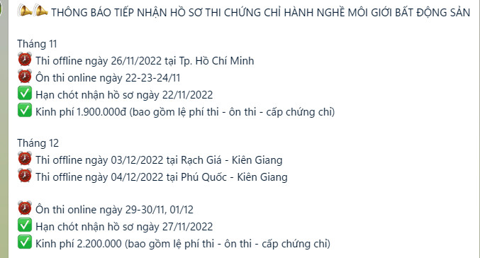 * Lưu ý: Đối với thí sinh có chứng chỉ môi giới bất động sản do nước ngoài cấp còn hiệu lực và trường hợp xin cấp lại chứng chỉ do chứng chỉ cũ hết hạn thì chỉ phải thi phần kiến thức cơ sở, không phải thi phần kiến thức chuyên môn.