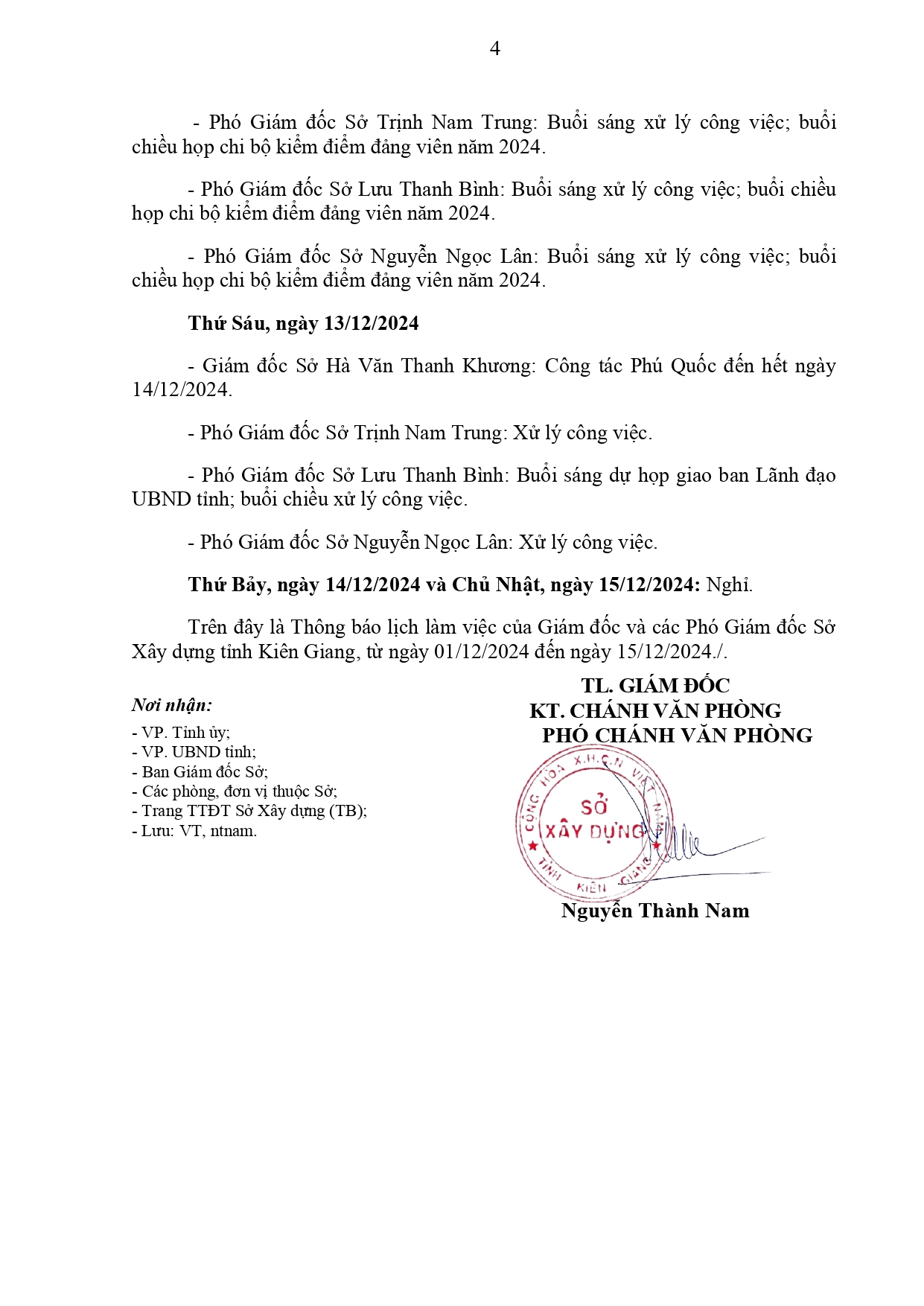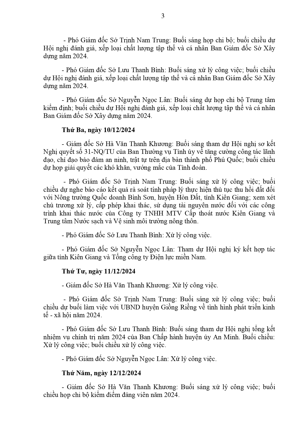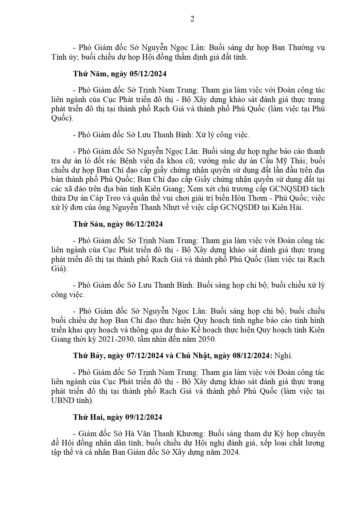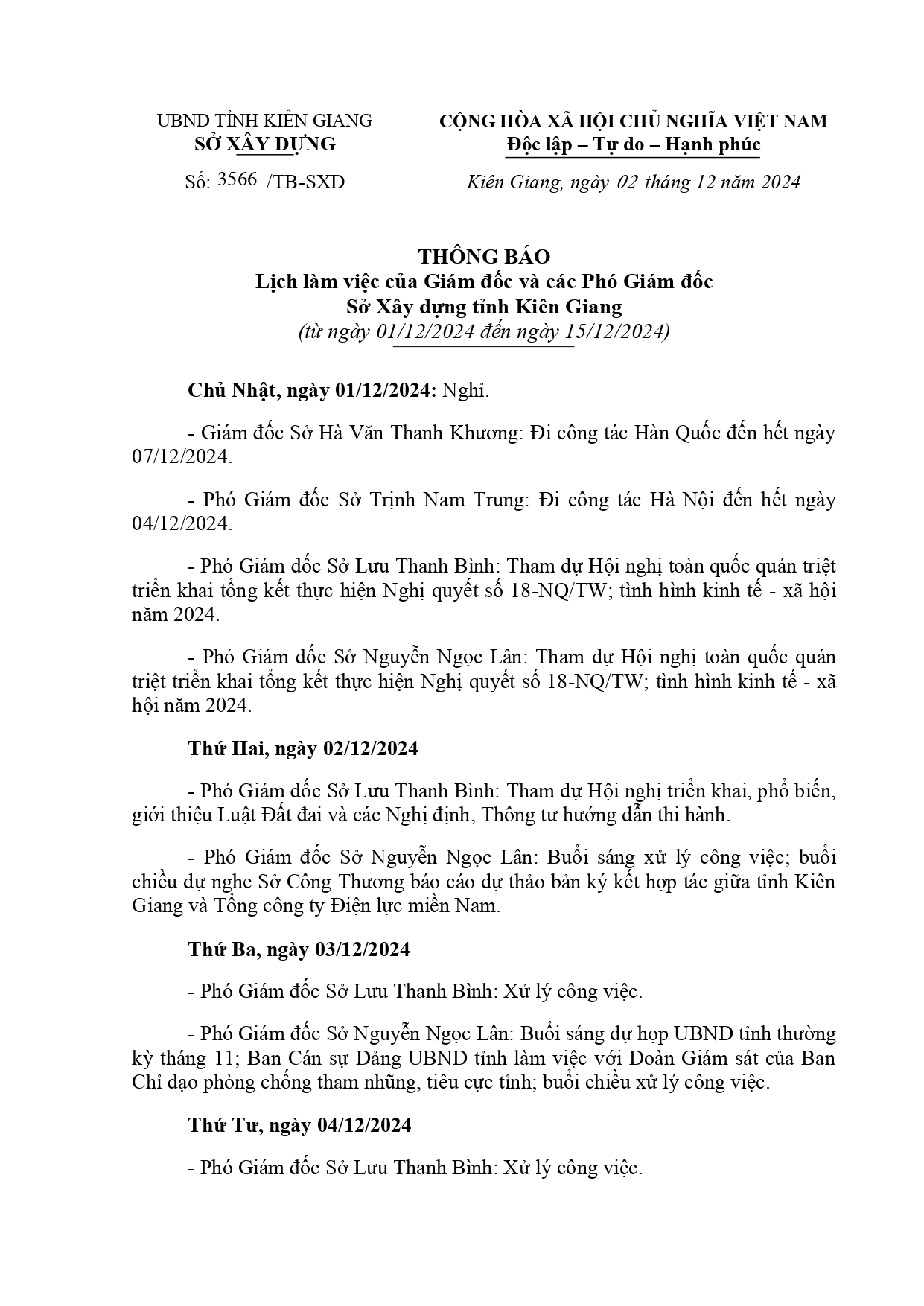 Lịch làm việc của Ban Giám đốc Sở Xây dựng Kiên Giang, từ ngày 01/12 đến ngày 15/12/2024