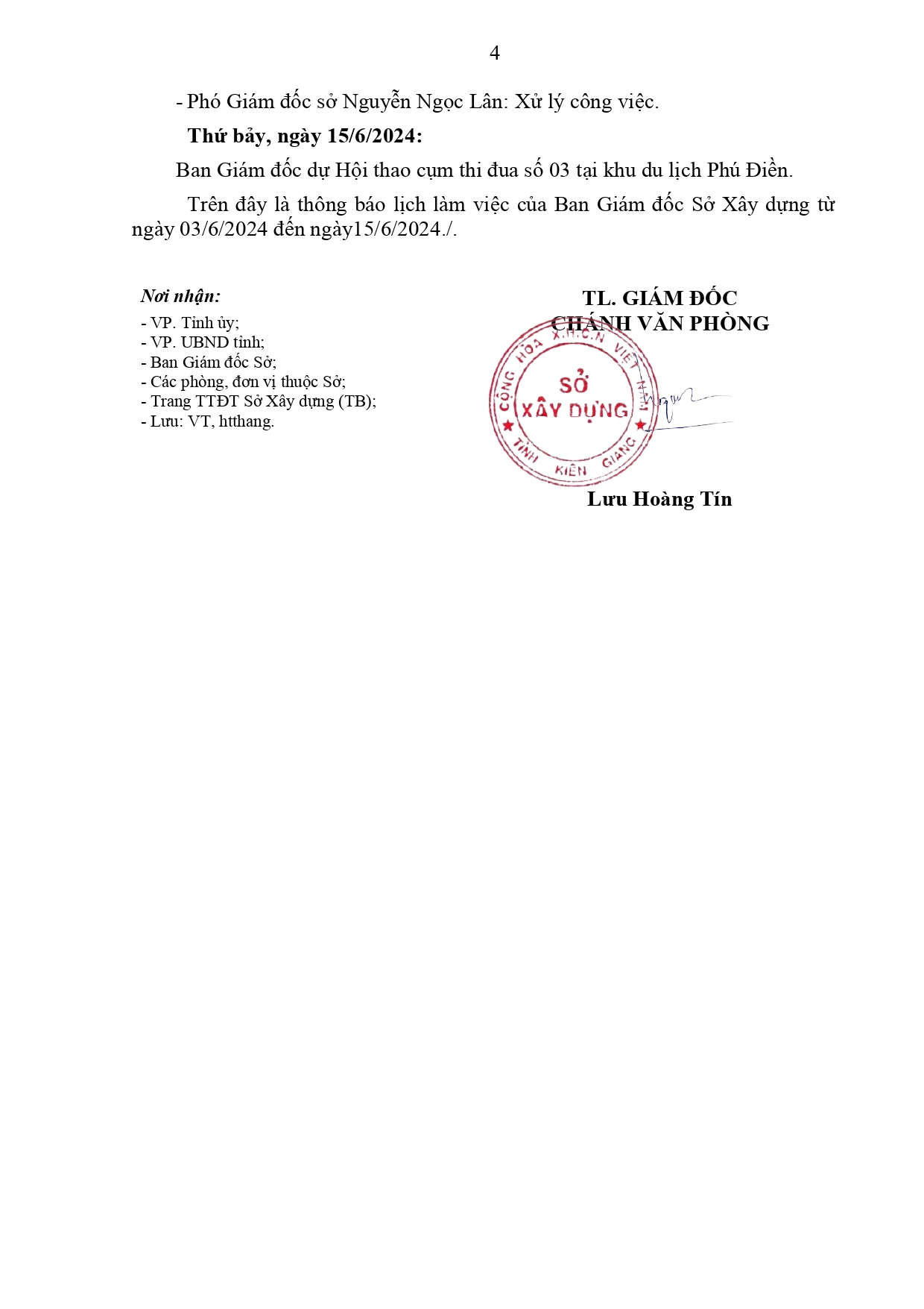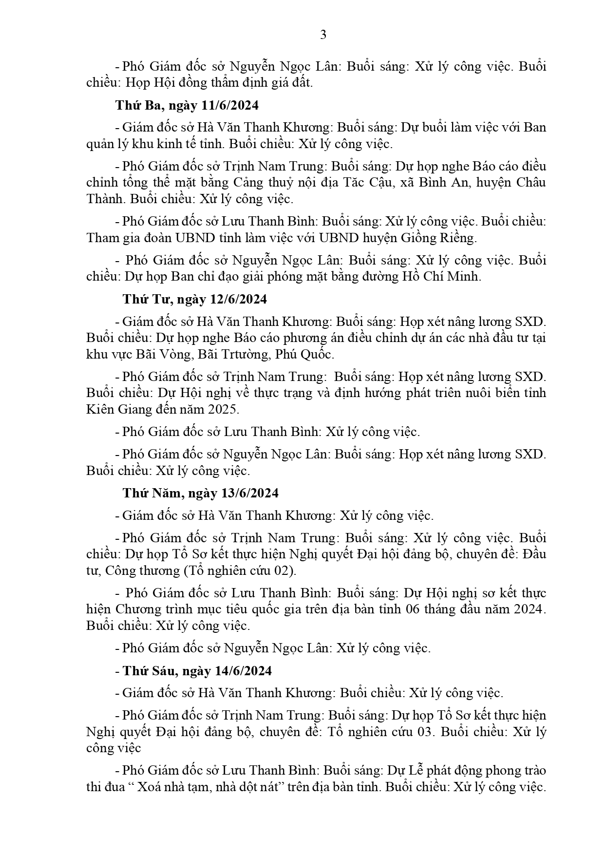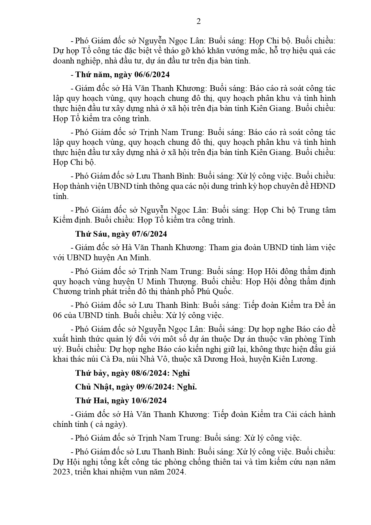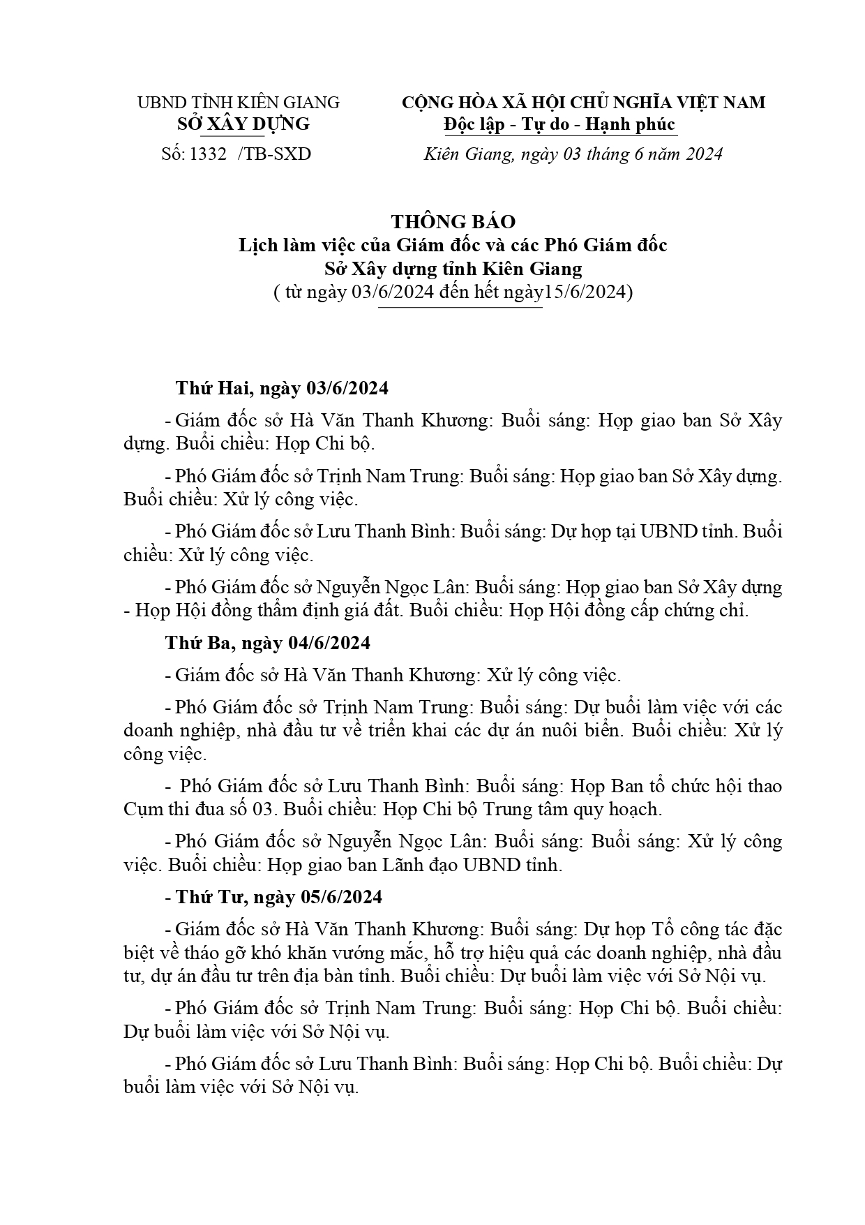 Lịch làm việc của Ban Giám đốc Sở Xây dựng Kiên Giang, từ ngày 03/6 đến ngày 15/6/2024
