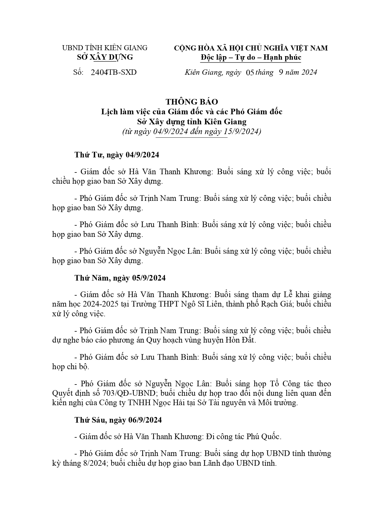 Sở Xây dựng tỉnh Kiên Giang thông báo lịch làm việc của Giám đốc và các Phó Giám đốc Sở Xây dựng tỉnh Kiên Giang, từ ngày 05/9 đến ngày 15/9/2024.