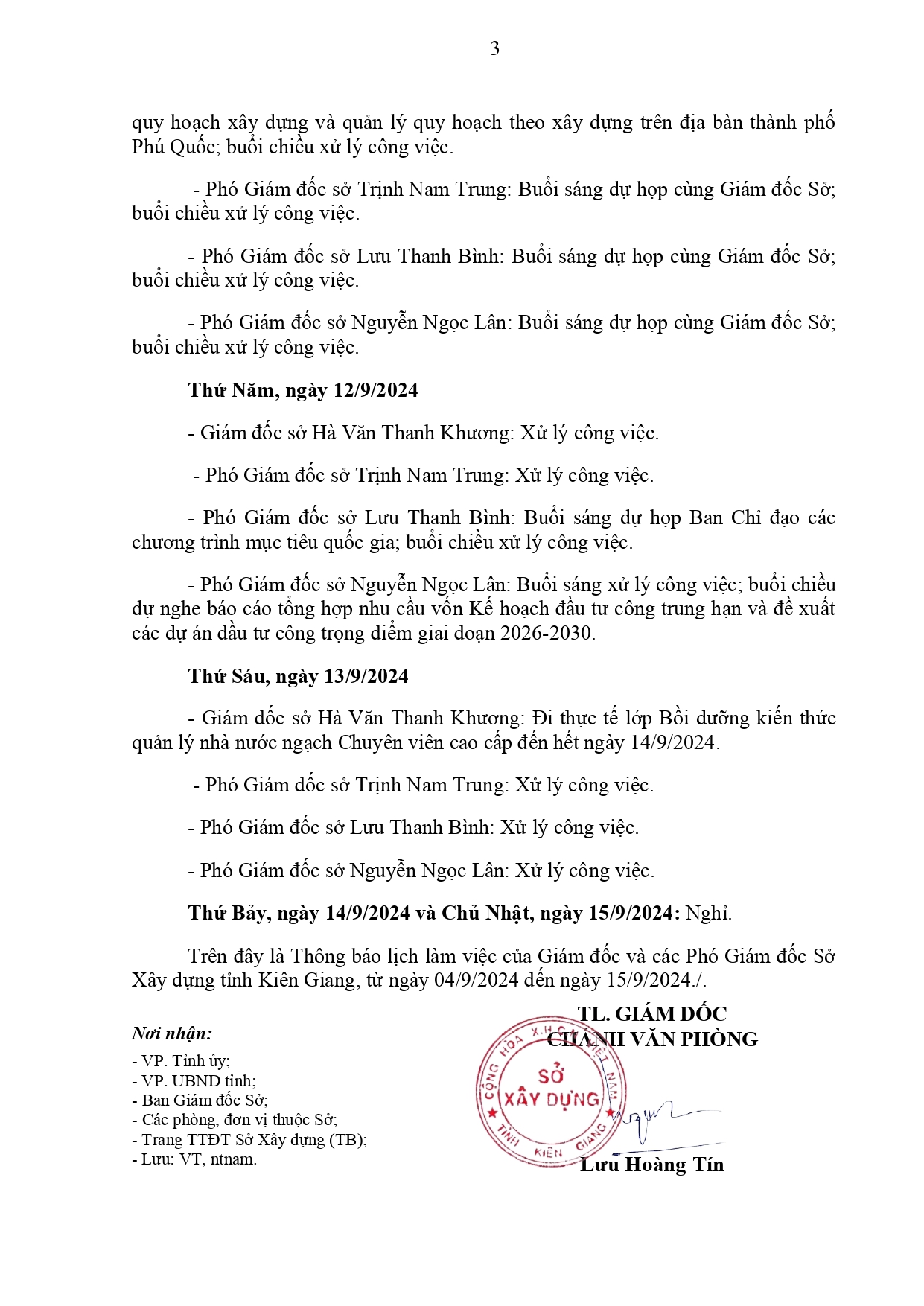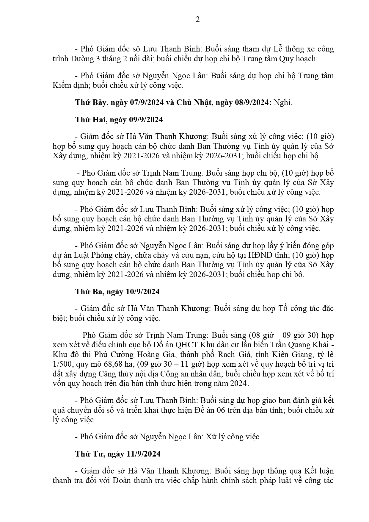 Lịch làm việc của Ban Giám đốc Sở Xây dựng Kiên Giang, từ ngày 04/9 đến ngày 15/9/2024