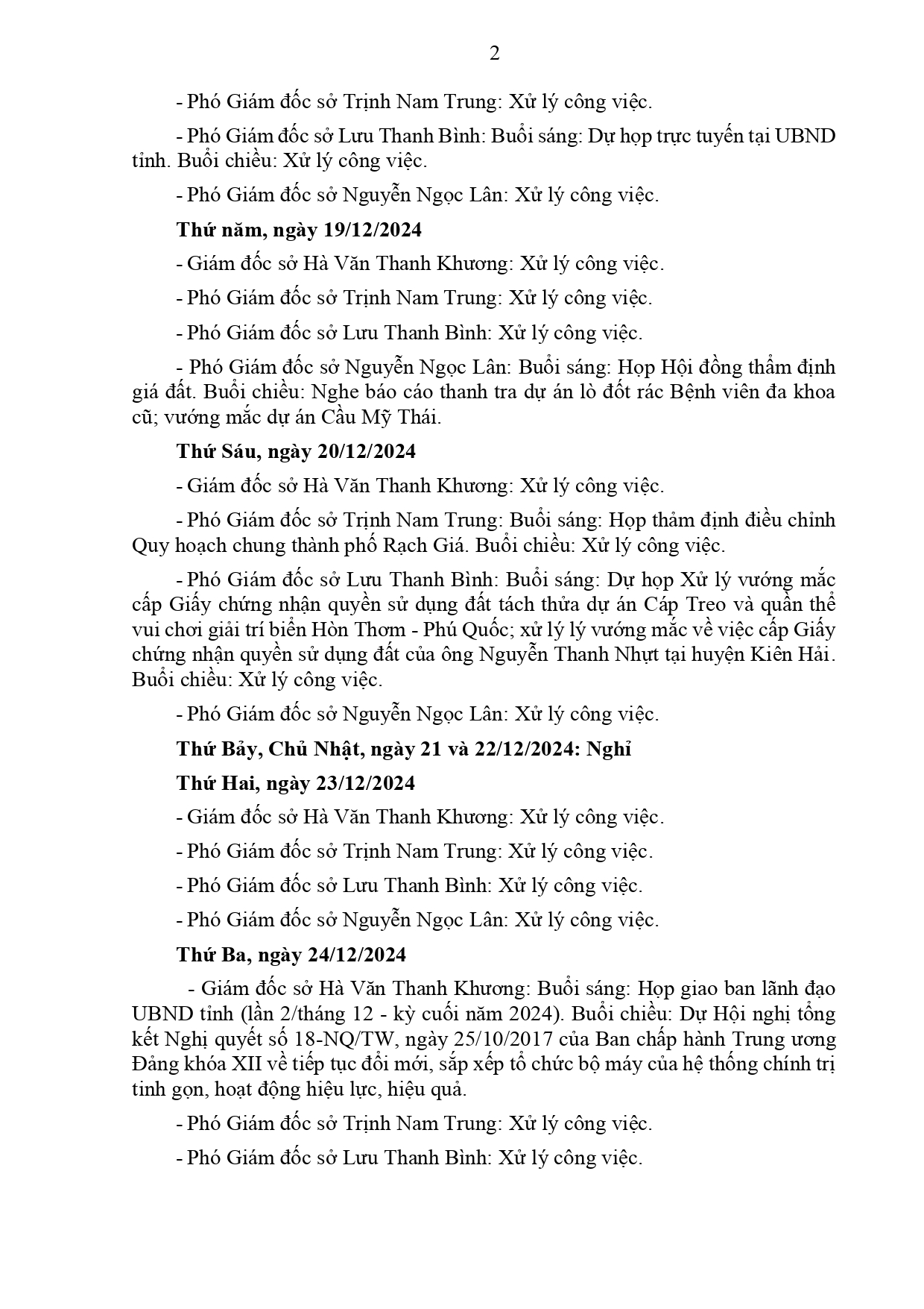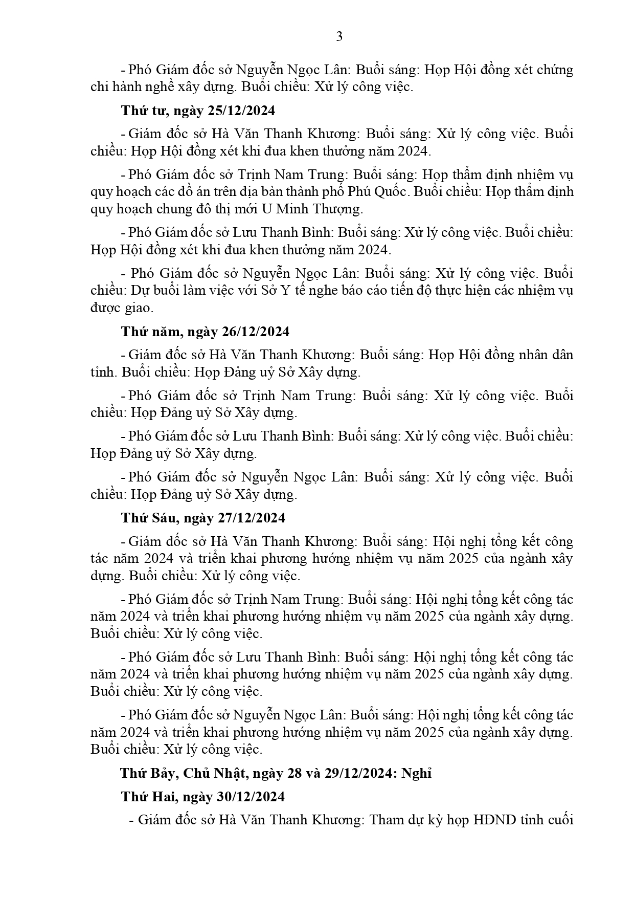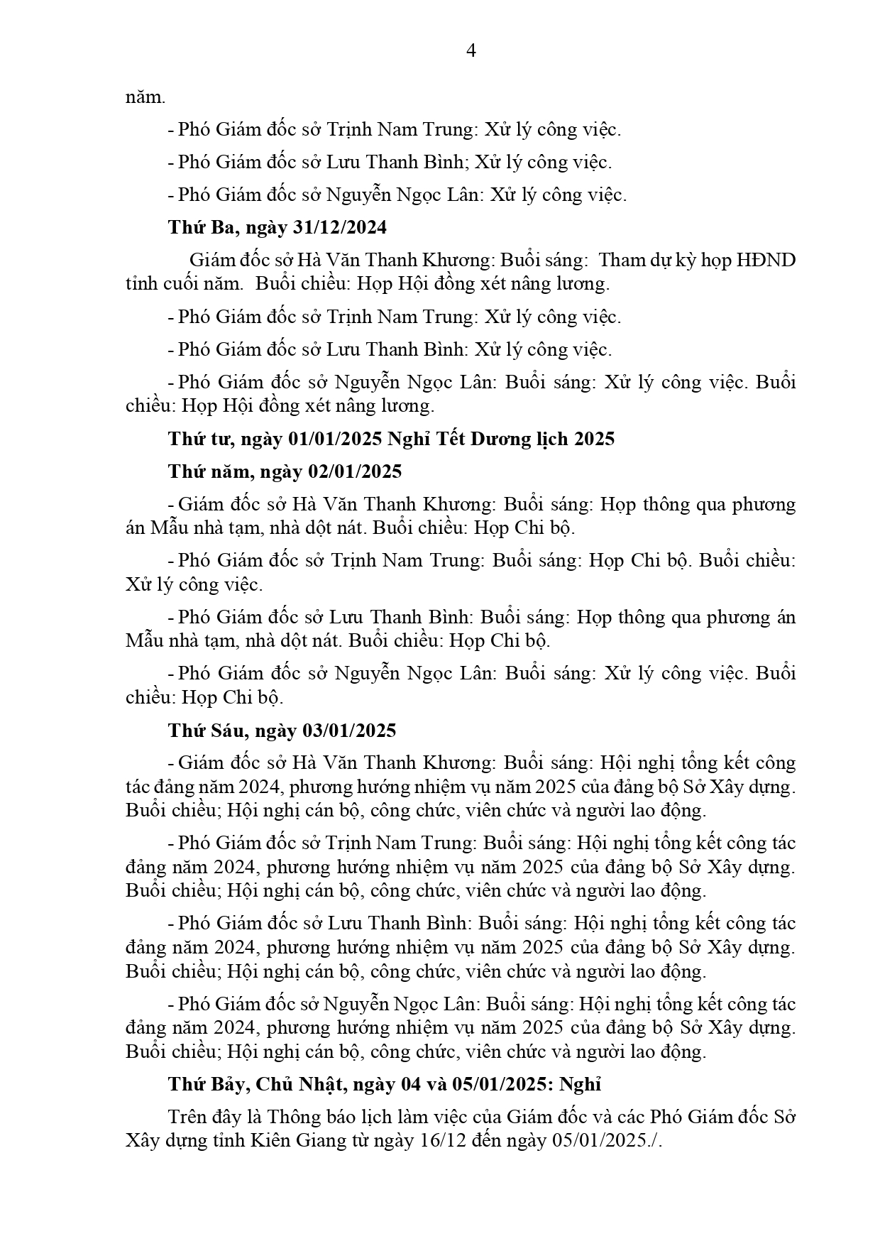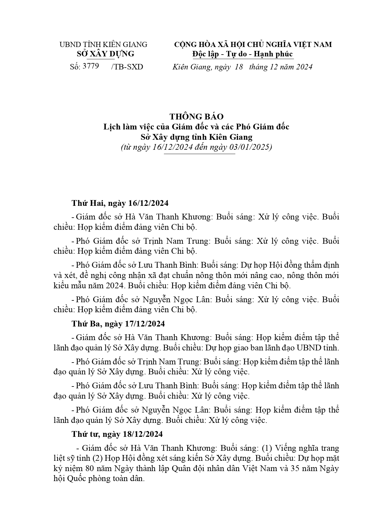 Lịch làm việc của Ban Giám đốc Sở Xây dựng Kiên Giang, từ ngày 16/12/2024 đến ngày 03/01/2025