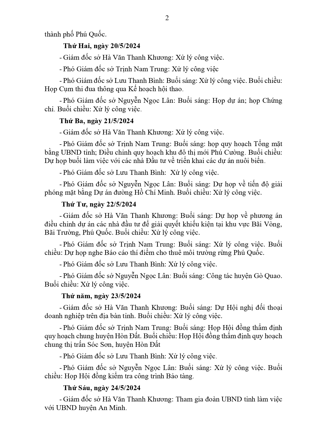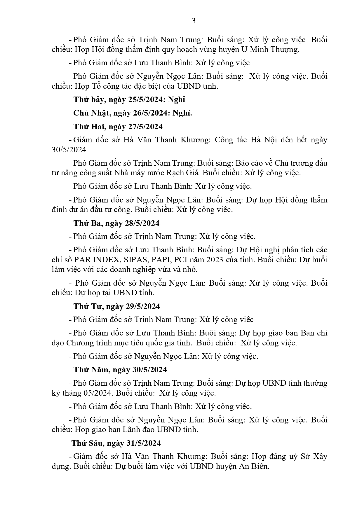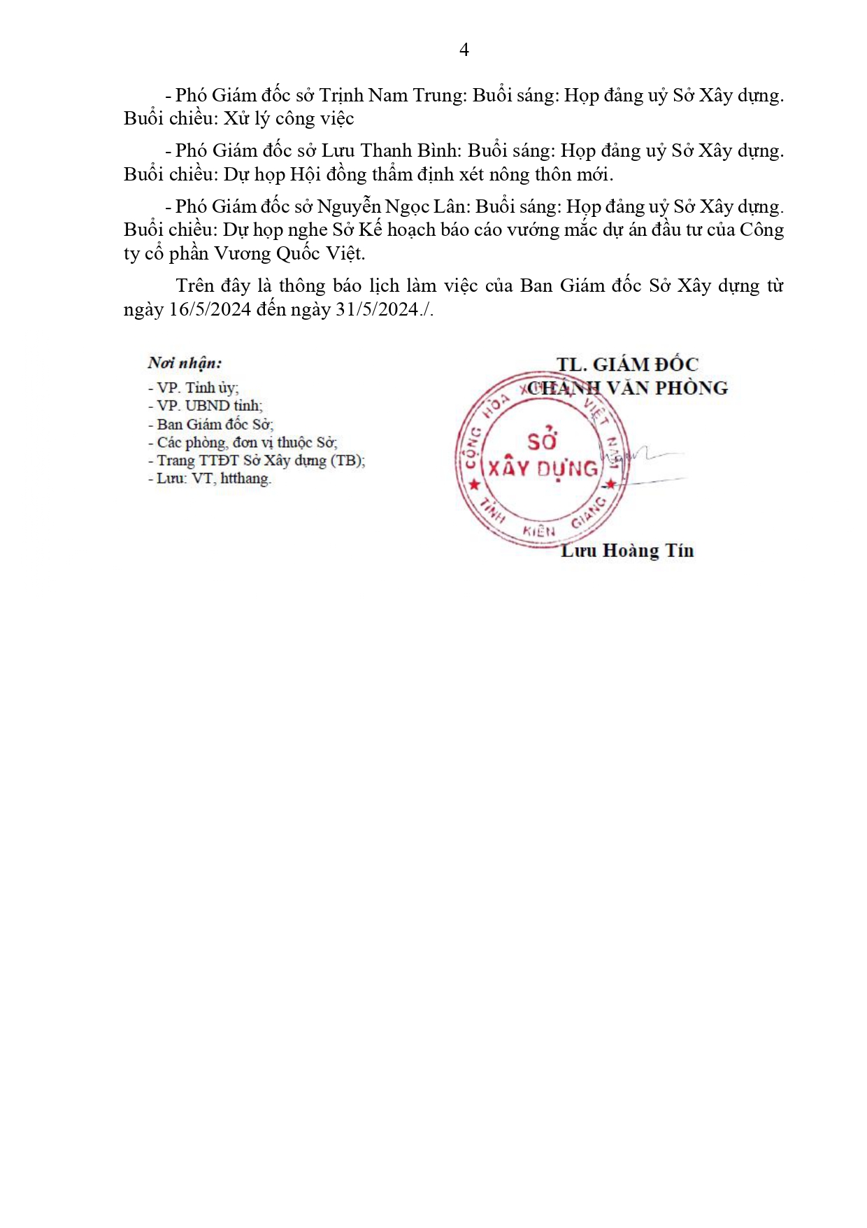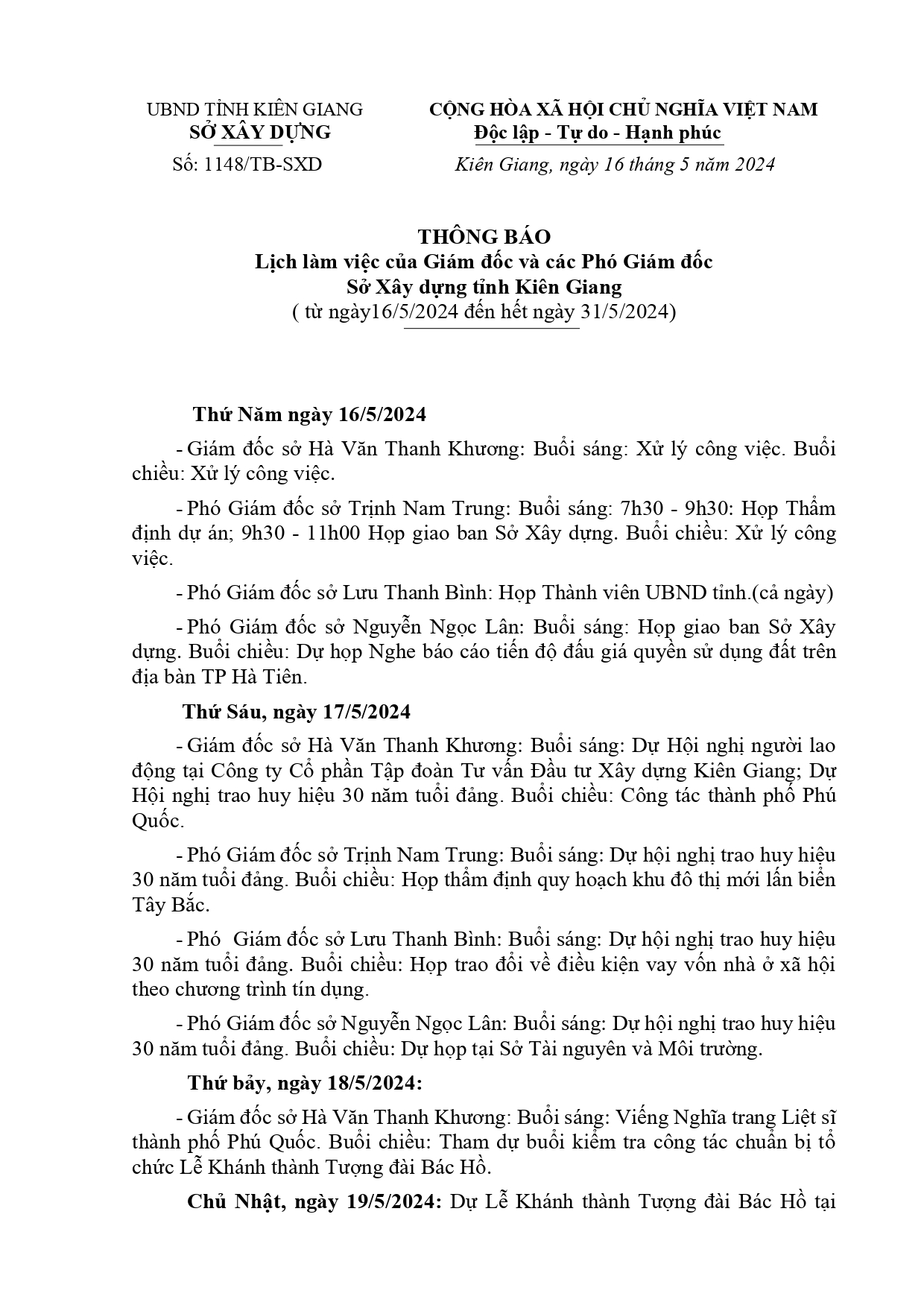 Lịch làm việc của Ban Giám đốc Sở Xây dựng Kiên Giang, từ ngày 16/5 đến ngày 31/5/2024