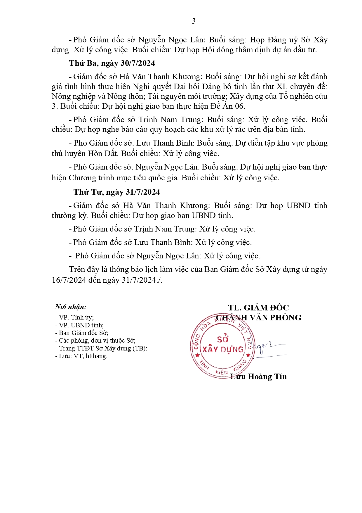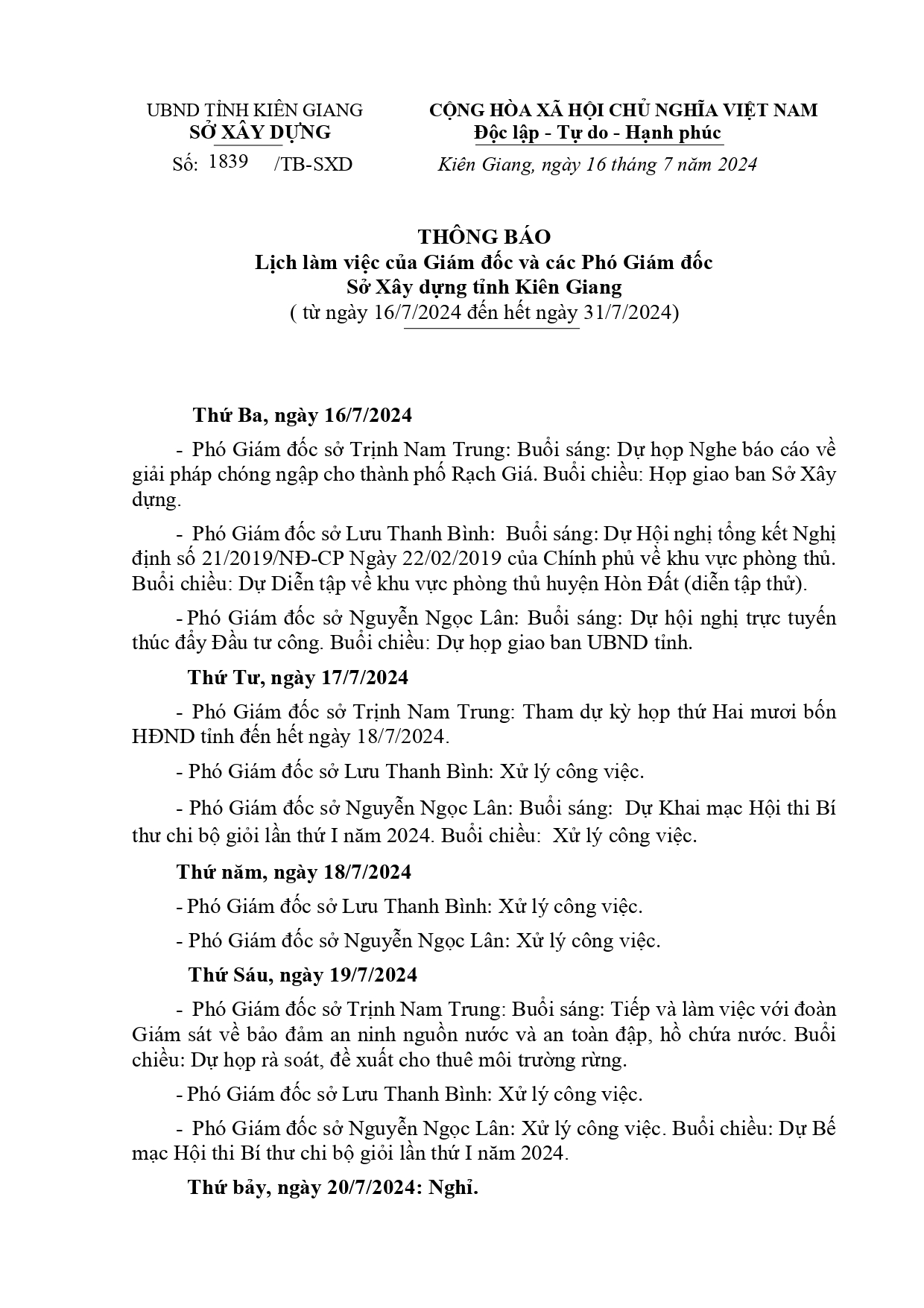 Lịch làm việc của Ban Giám đốc Sở Xây dựng Kiên Giang, từ ngày 16/7 đến ngày 31/7/2024