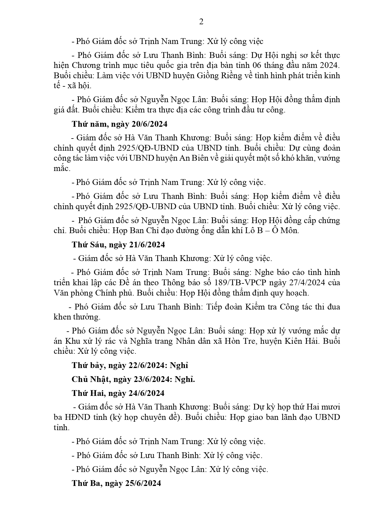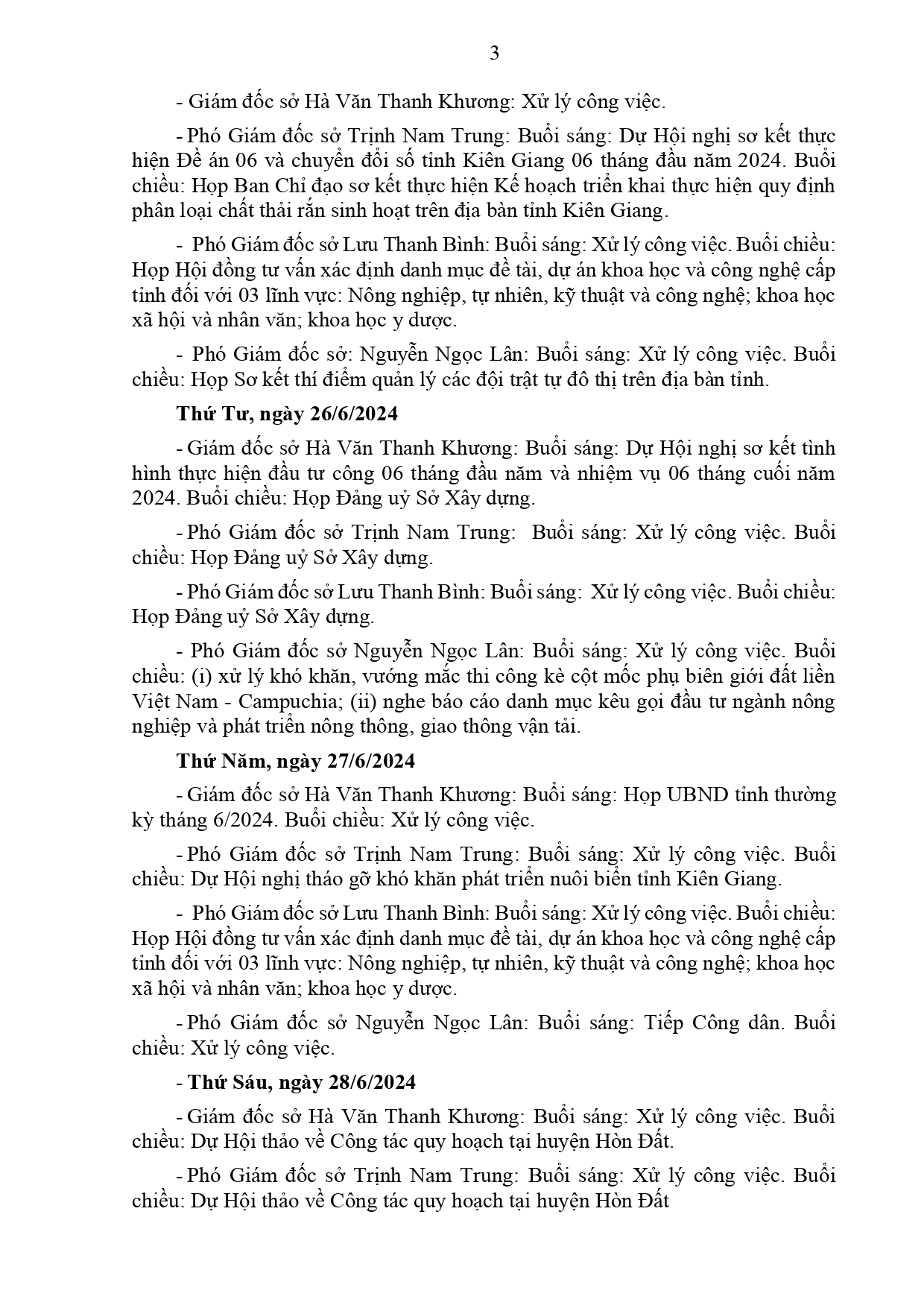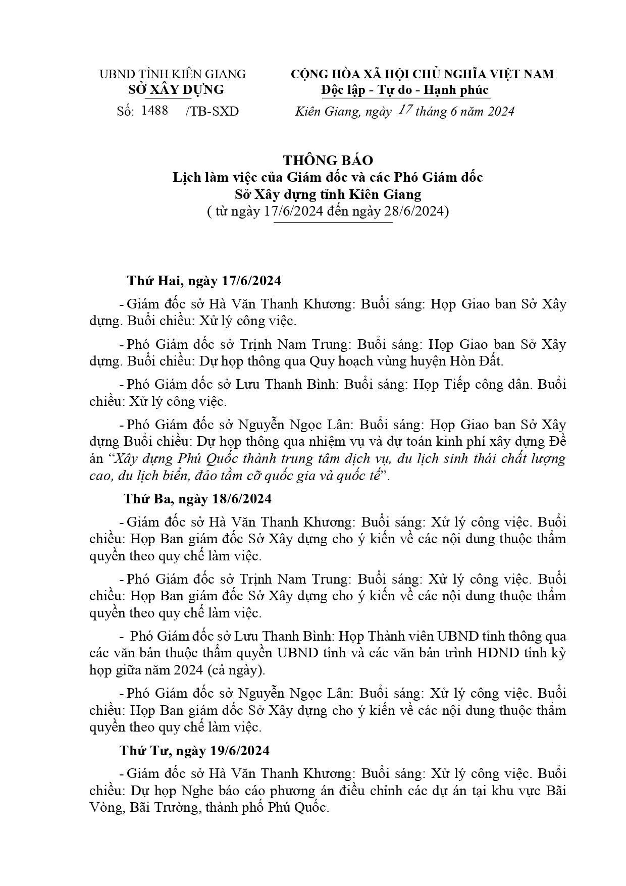 Lịch làm việc của Ban Giám đốc Sở Xây dựng Kiên Giang, từ ngày 17/6 đến ngày 28/6/2024