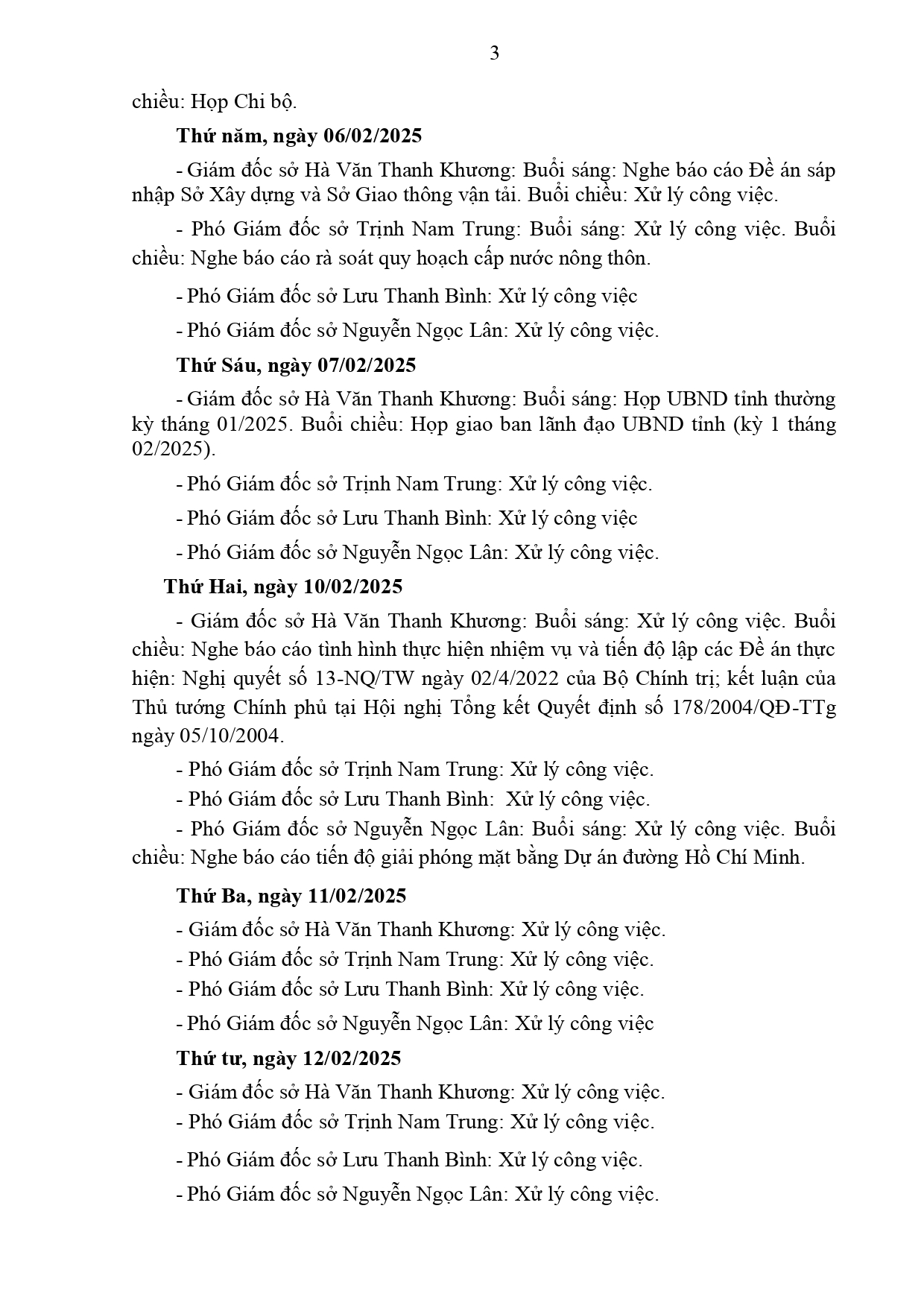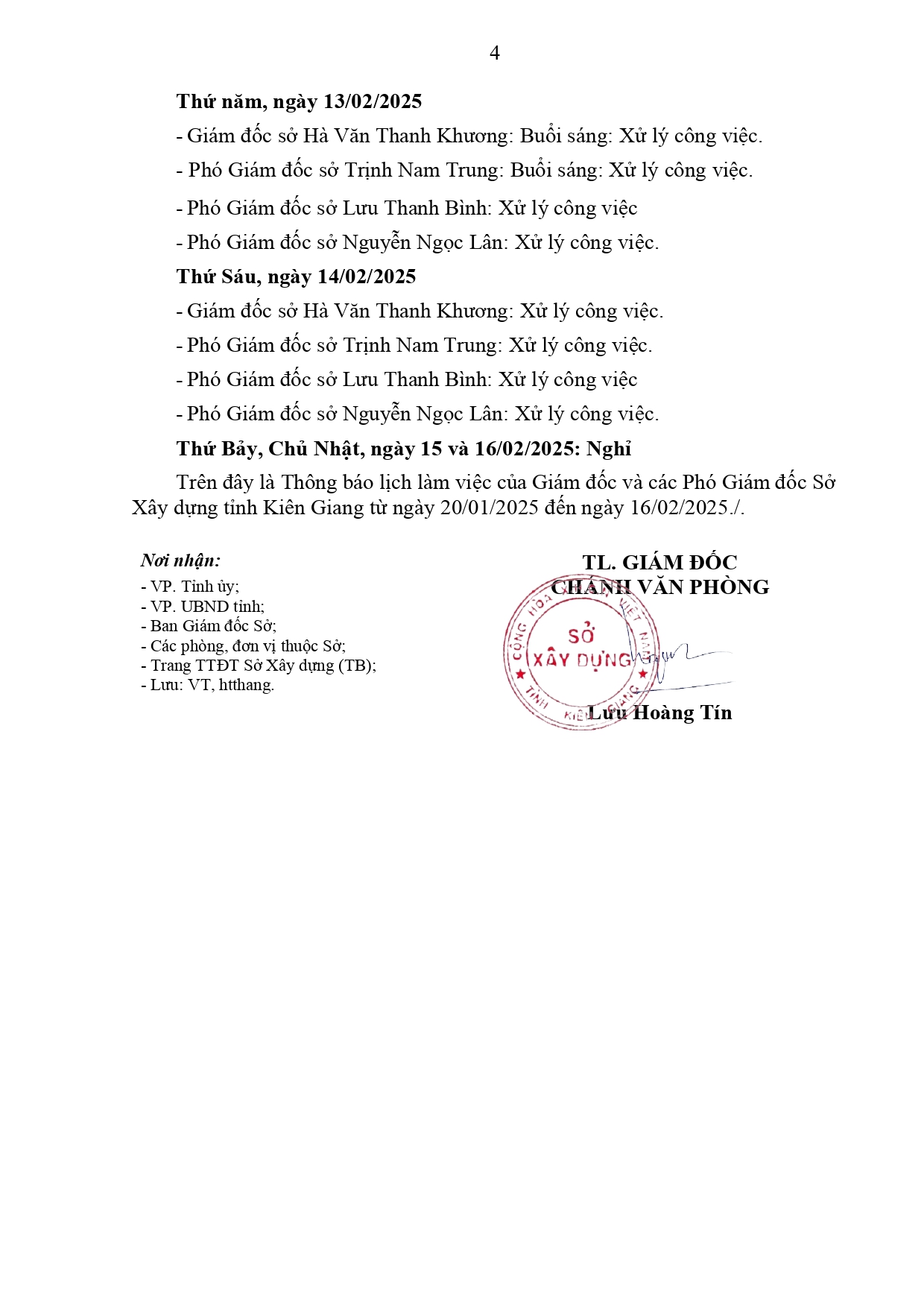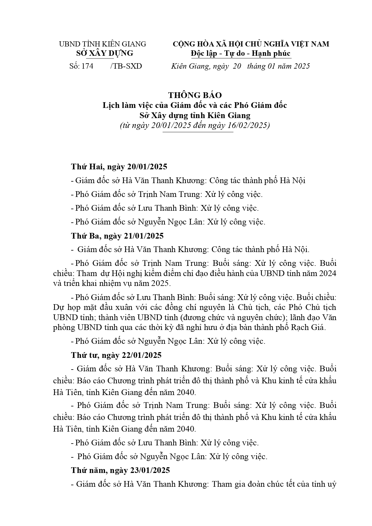 Lịch làm việc của Ban Giám đốc Sở Xây dựng Kiên Giang, từ ngày 20/01 đến ngày 16/02/2025