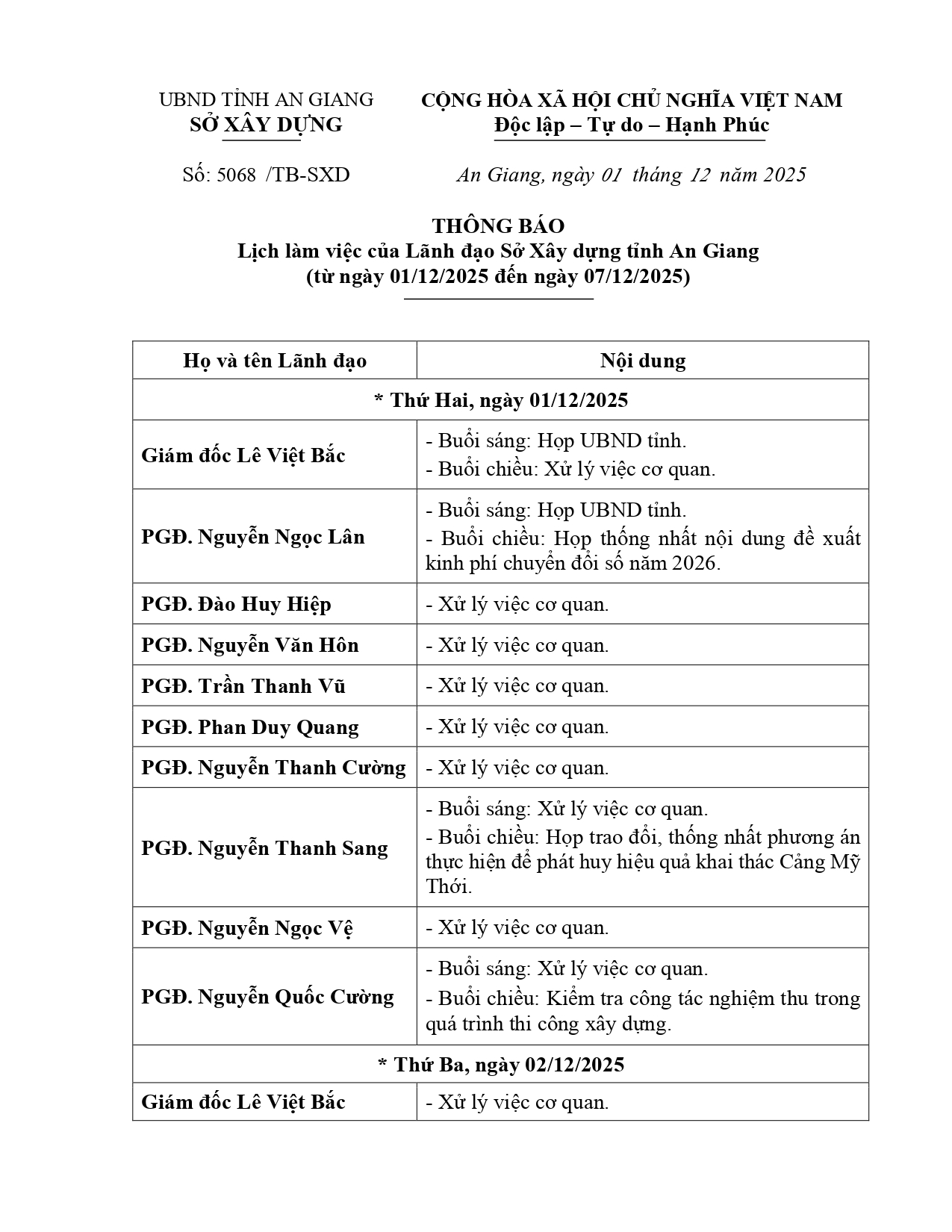 Thông báo số 5068/TB-SXD ngày 01/12/2025 của Sở Xây dựng tỉnh An Giang lịch làm việc của Lãnh đạo Sở Xây dựng tỉnh An Giang (từ ngày 01/12/2025 đến ngày 07/12/2025).