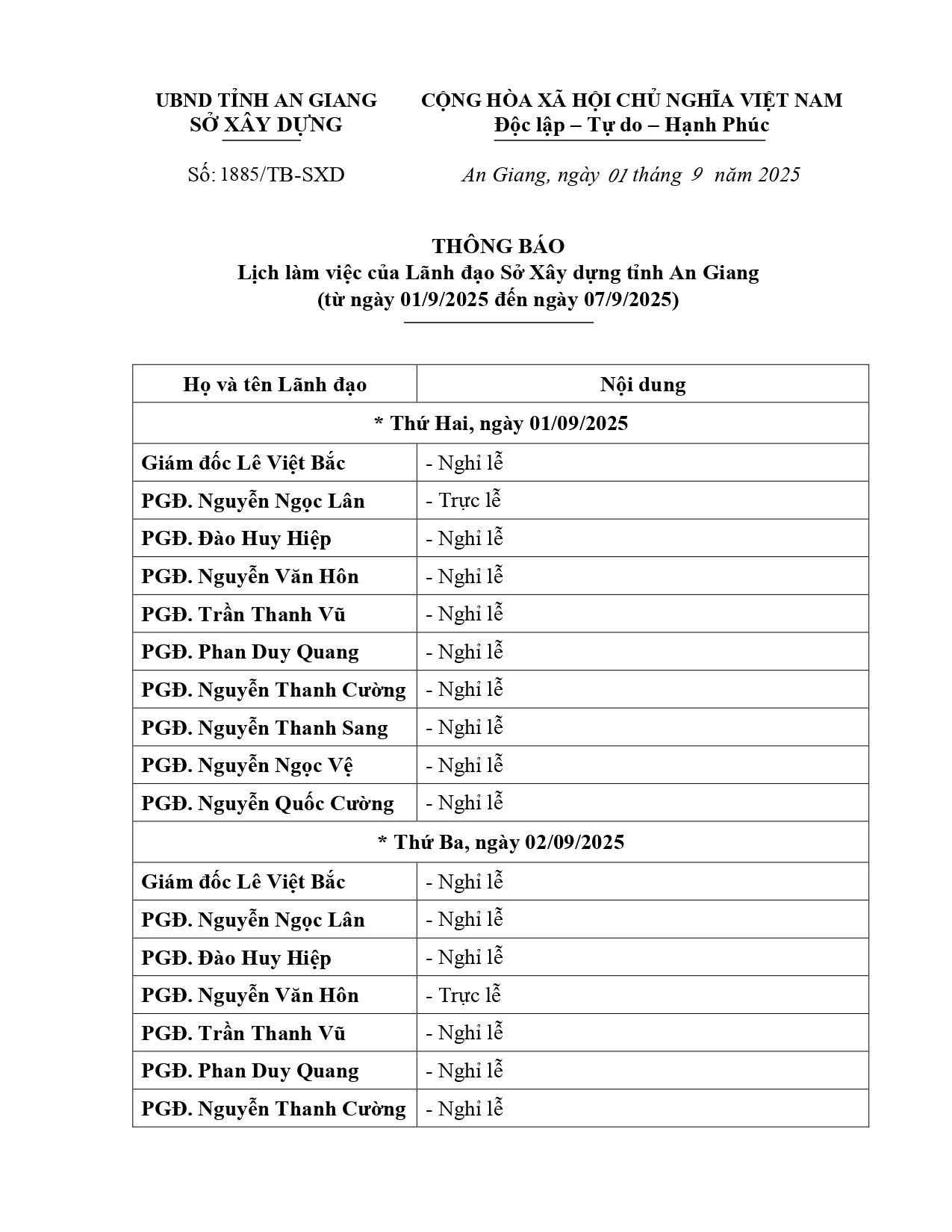 Thông báo số 1885/TB-SXD ngày 01/9/2025 của Sở Xây dựng tỉnh An Giang lịch làm việc của Lãnh đạo Sở Xây dựng tỉnh An Giang (từ ngày 01/9/2025 đến ngày 07/9/2025).