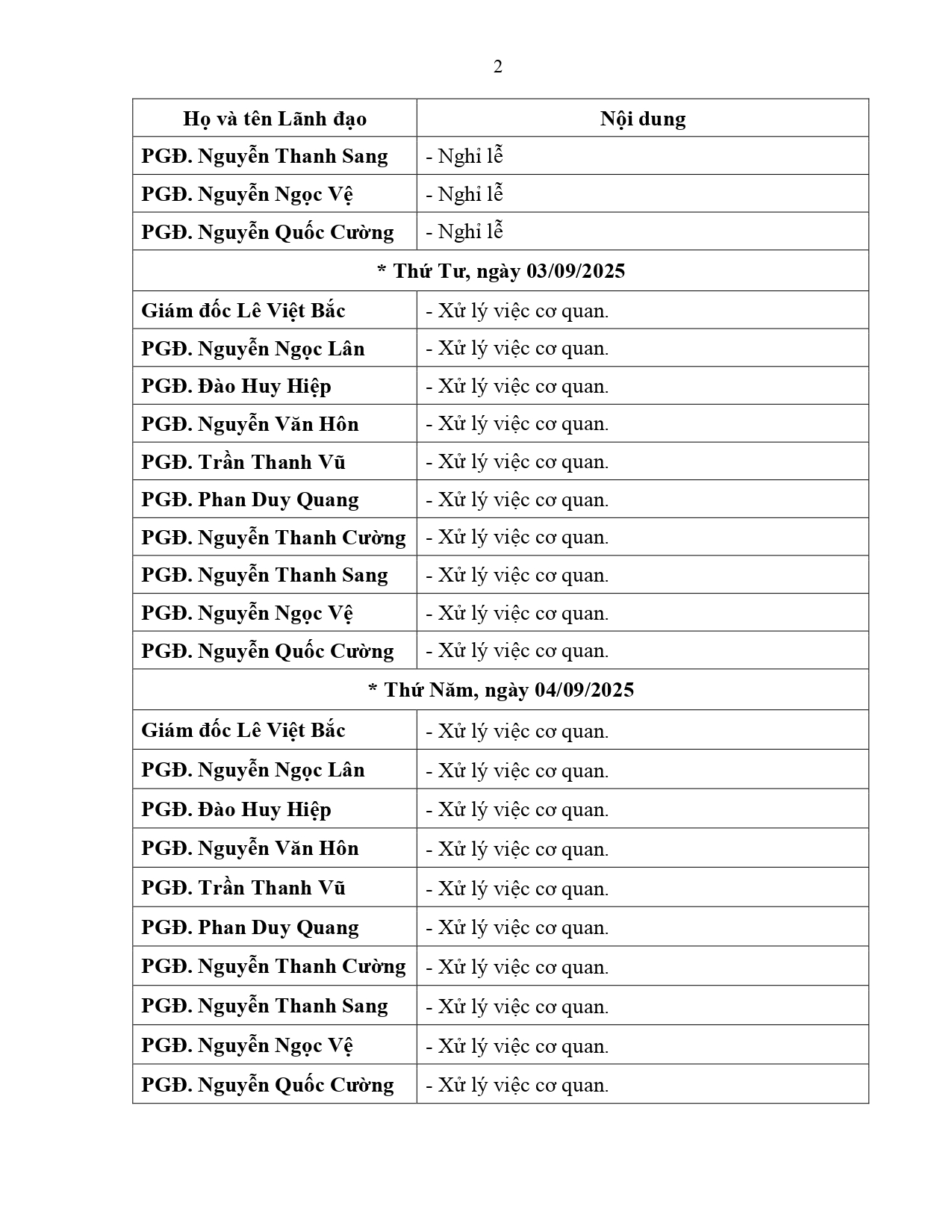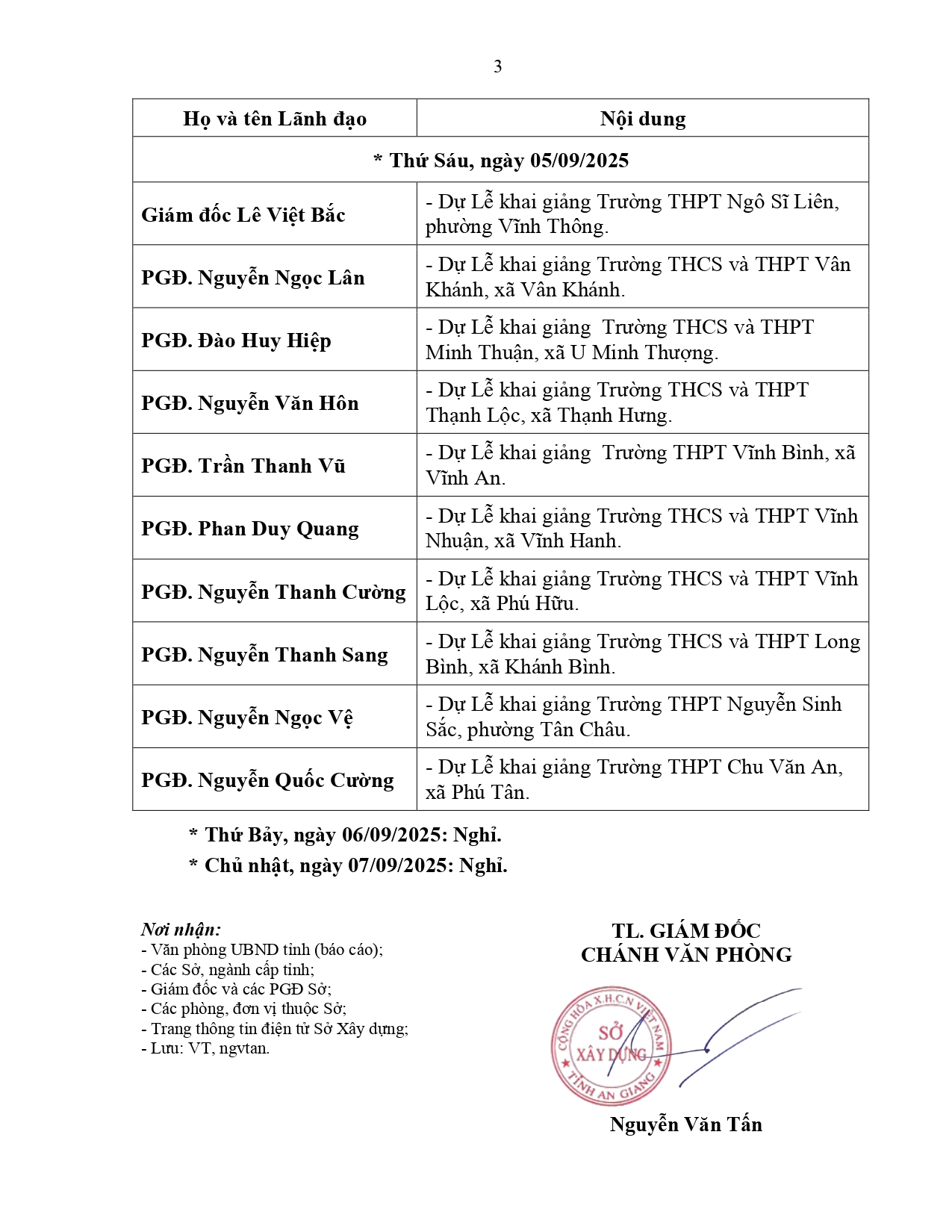 Lịch làm việc của Lãnh đạo Sở Xây dựng tỉnh An Giang (từ ngày 01/9/2025 đến ngày 07/9/2025)