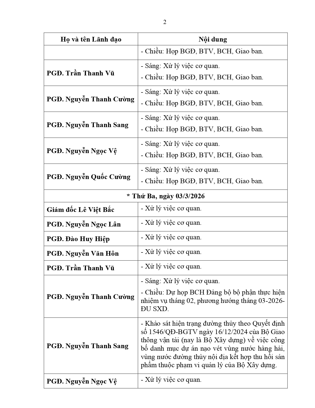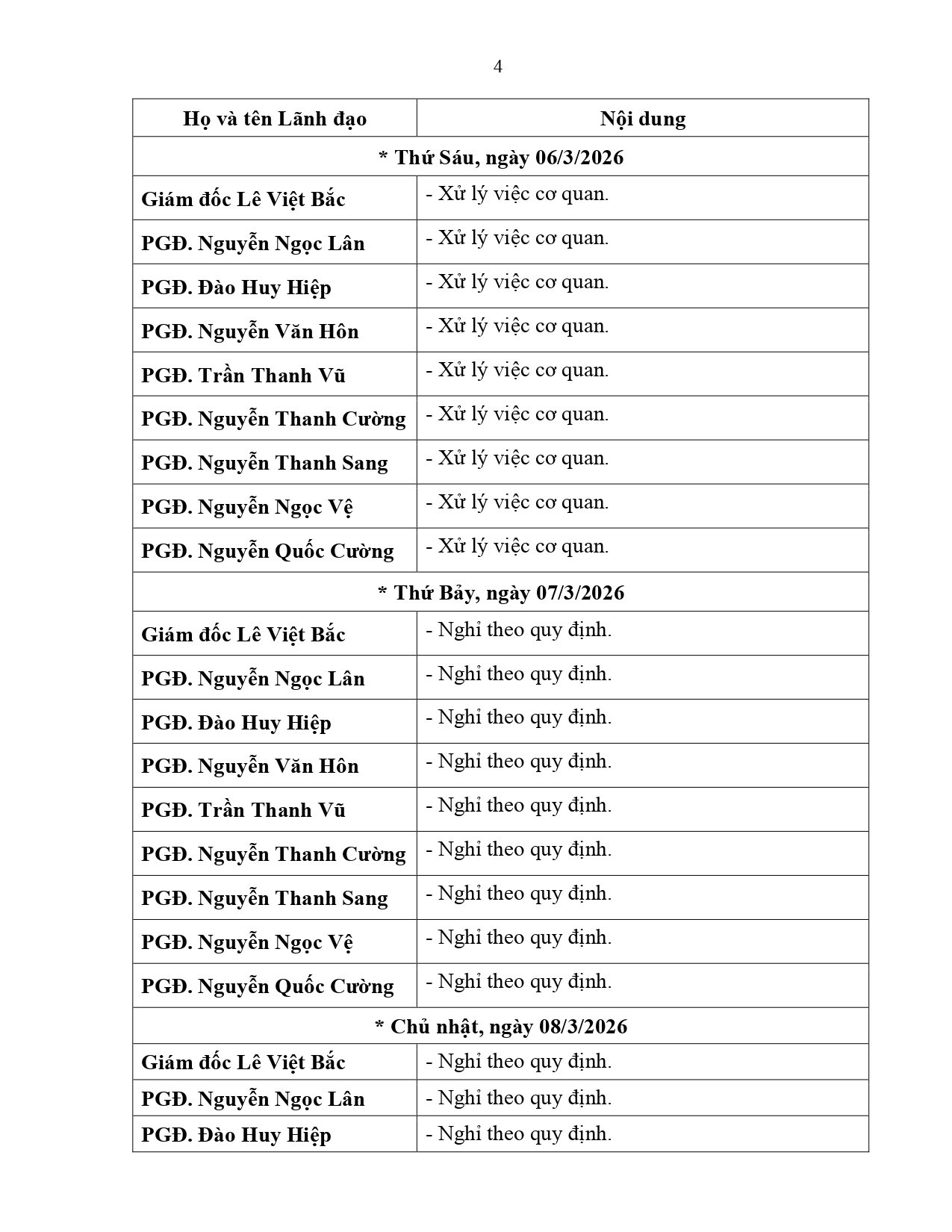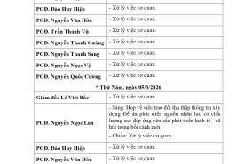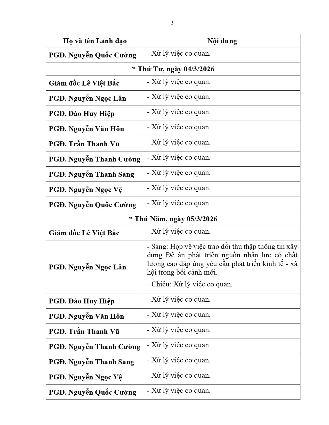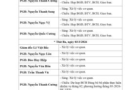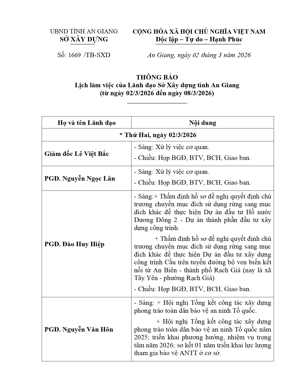 Thông báo số 1669/TB-SXD ngày 02/3/2026 của Sở Xây dựng tỉnh An Giang lịch làm việc của Lãnh đạo Sở Xây dựng tỉnh An Giang (từ ngày 02/3/2026 đến ngày 08/3/2026).