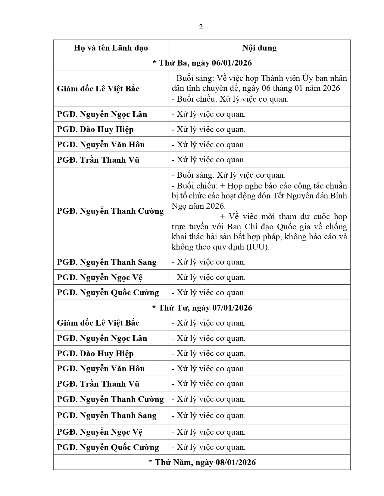 Lịch làm việc của Lãnh đạo Sở Xây dựng tỉnh An Giang, từ ngày 05/01/2026 đến ngày 11/01/2026