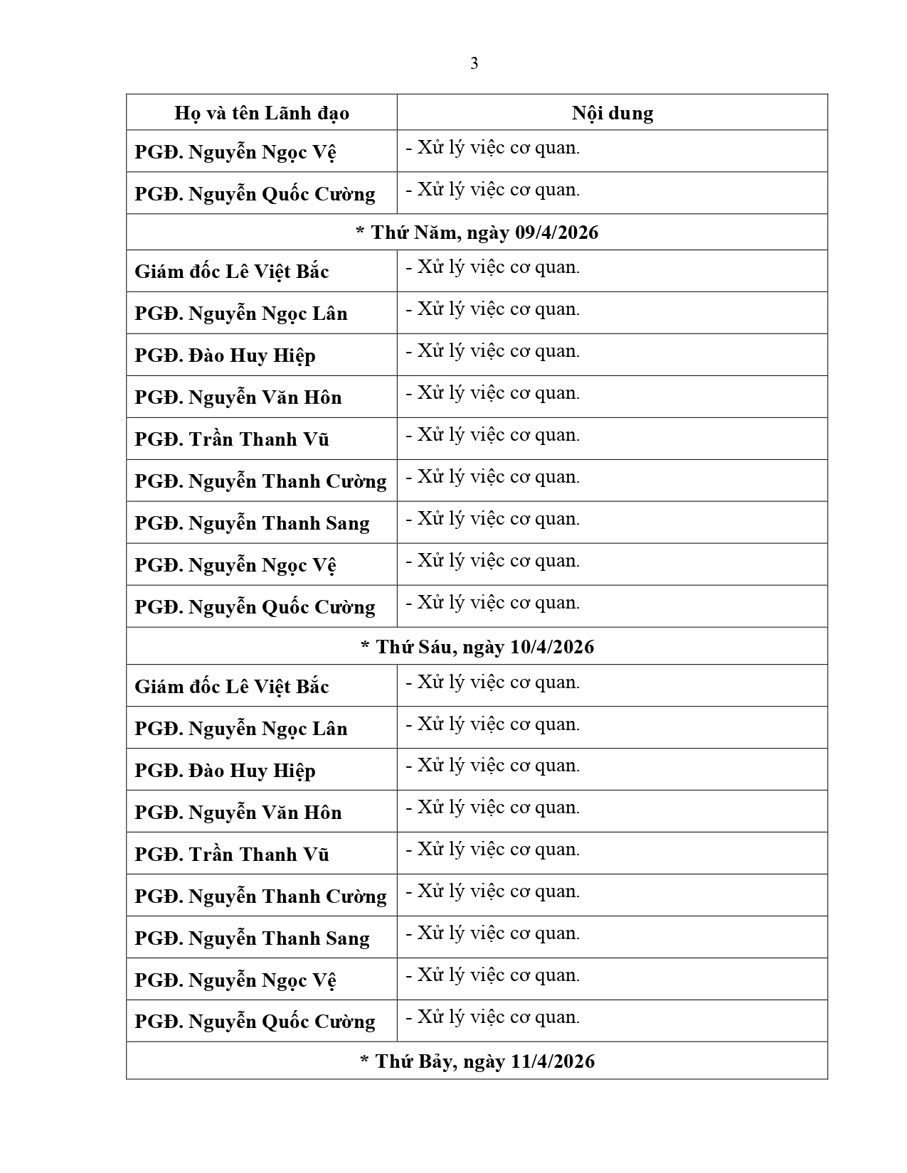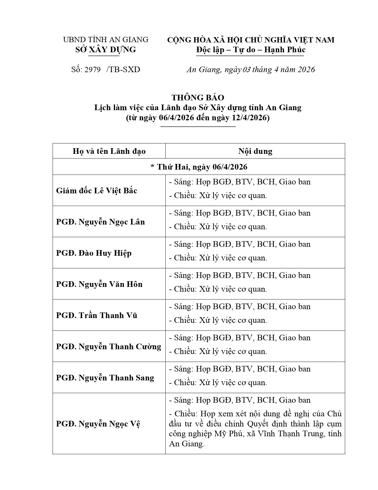 Thông báo số 2979/TB-SXD ngày 03/4/2026 của Sở Xây dựng tỉnh An Giang lịch làm việc của Lãnh đạo Sở Xây dựng tỉnh An Giang (từ ngày 06/4/2026 đến ngày 12/4/2026).