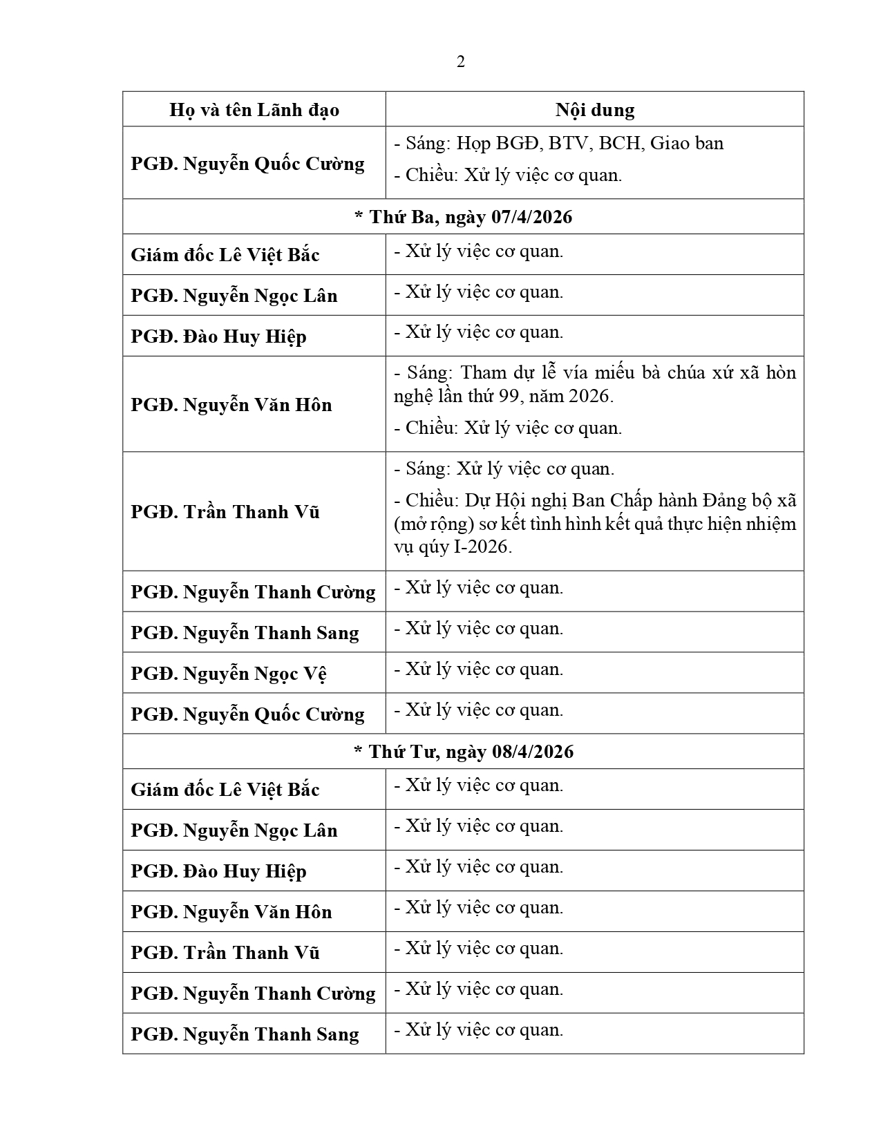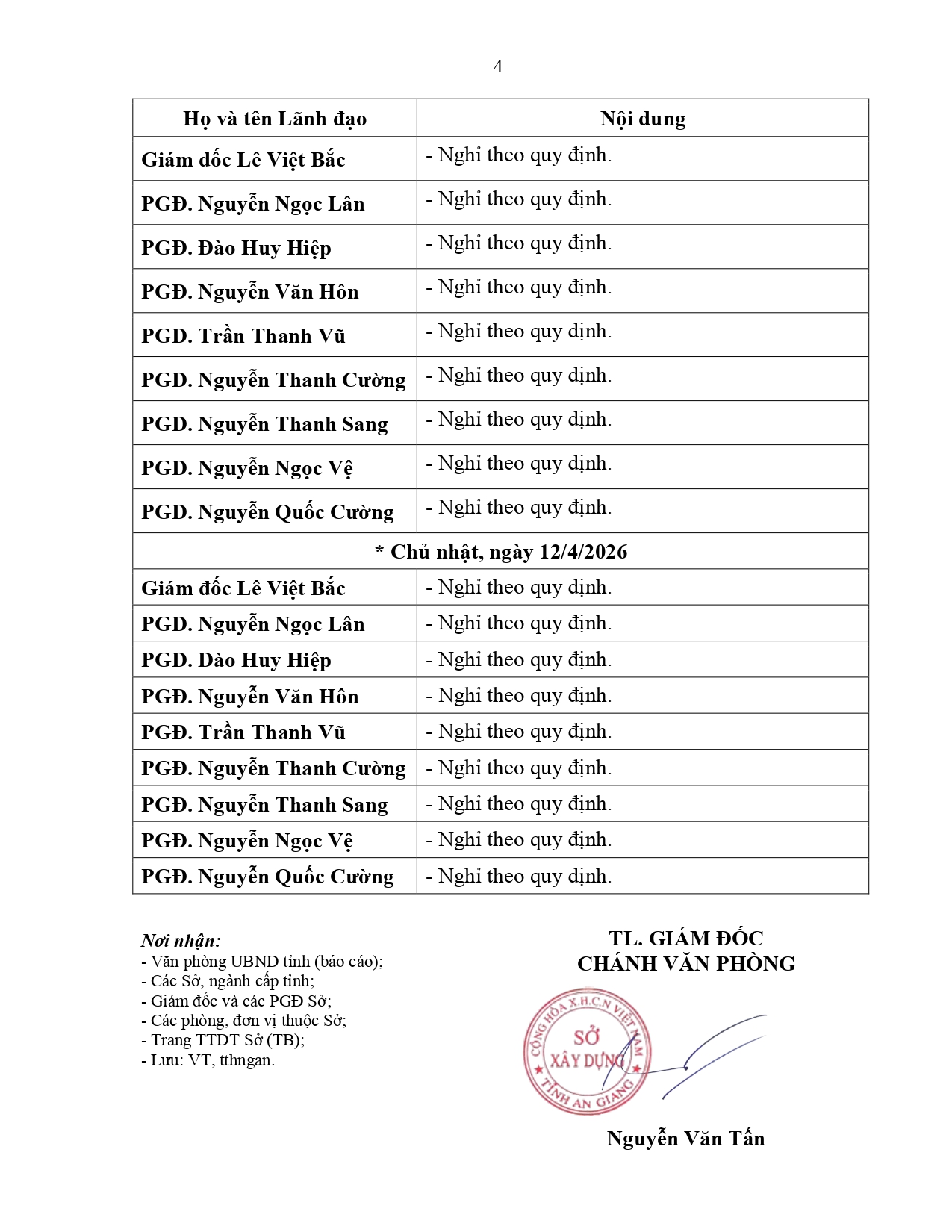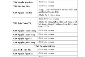Lịch làm việc của Lãnh đạo Sở Xây dựng tỉnh An Giang, từ ngày 06/4/2026 đến ngày 12/4/2026