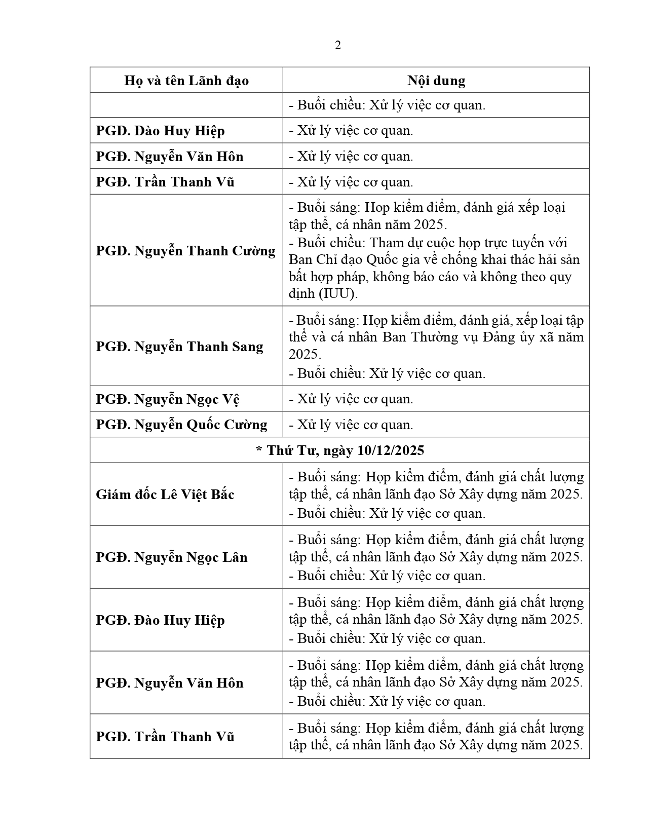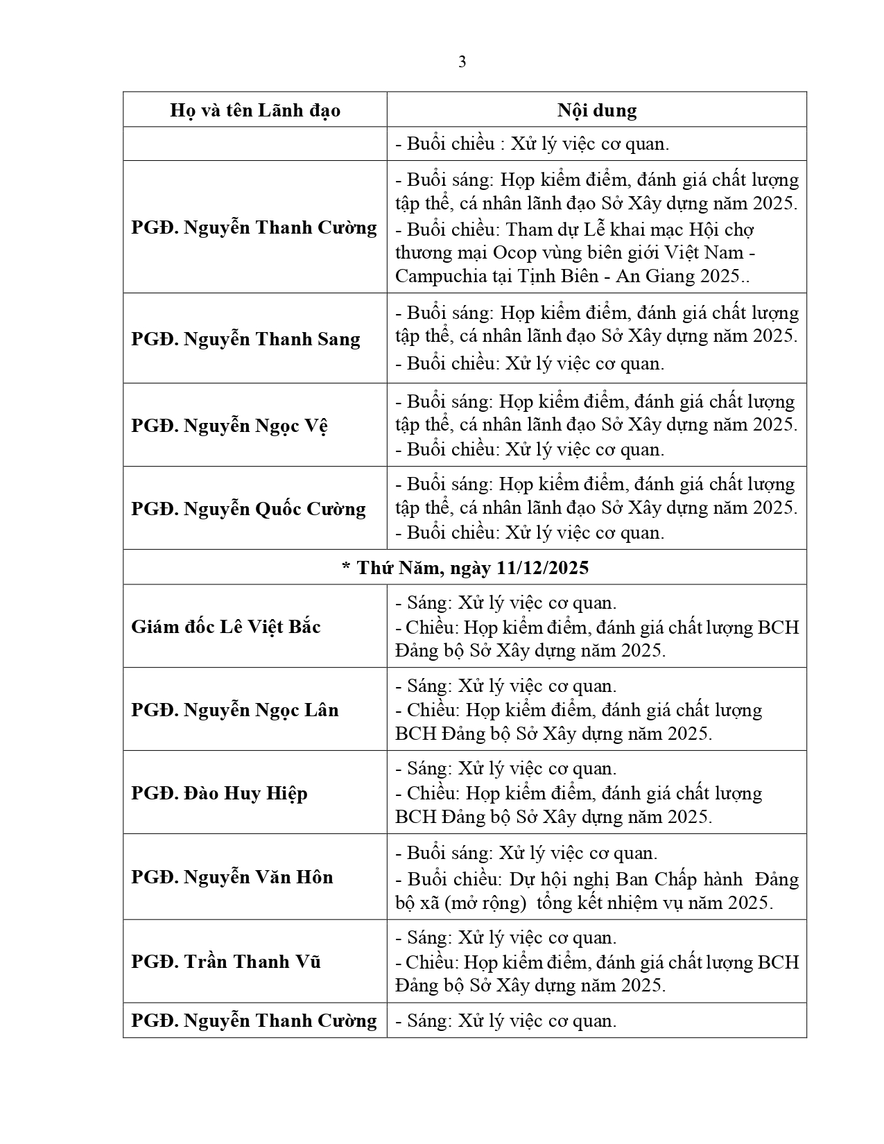 Lịch làm việc của Lãnh đạo Sở Xây dựng tỉnh An Giang, từ ngày 08/12/2025 đến ngày 14/12/2025