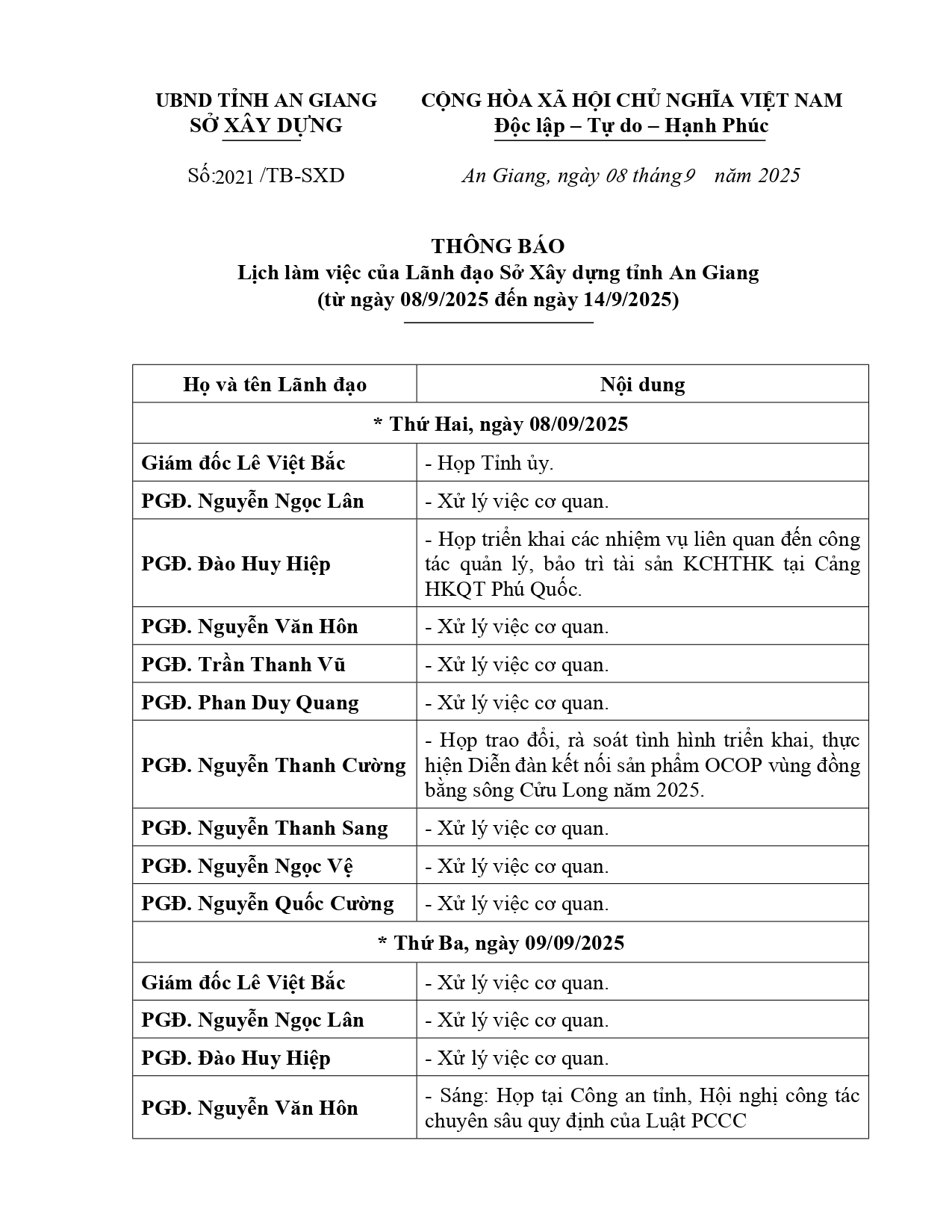 Thông báo số 2021/TB-SXD ngày 08/9/2025 của Sở Xây dựng tỉnh An Giang lịch làm việc của Lãnh đạo Sở Xây dựng tỉnh An Giang (từ ngày 08/9/2025 đến ngày 14/9/2025).