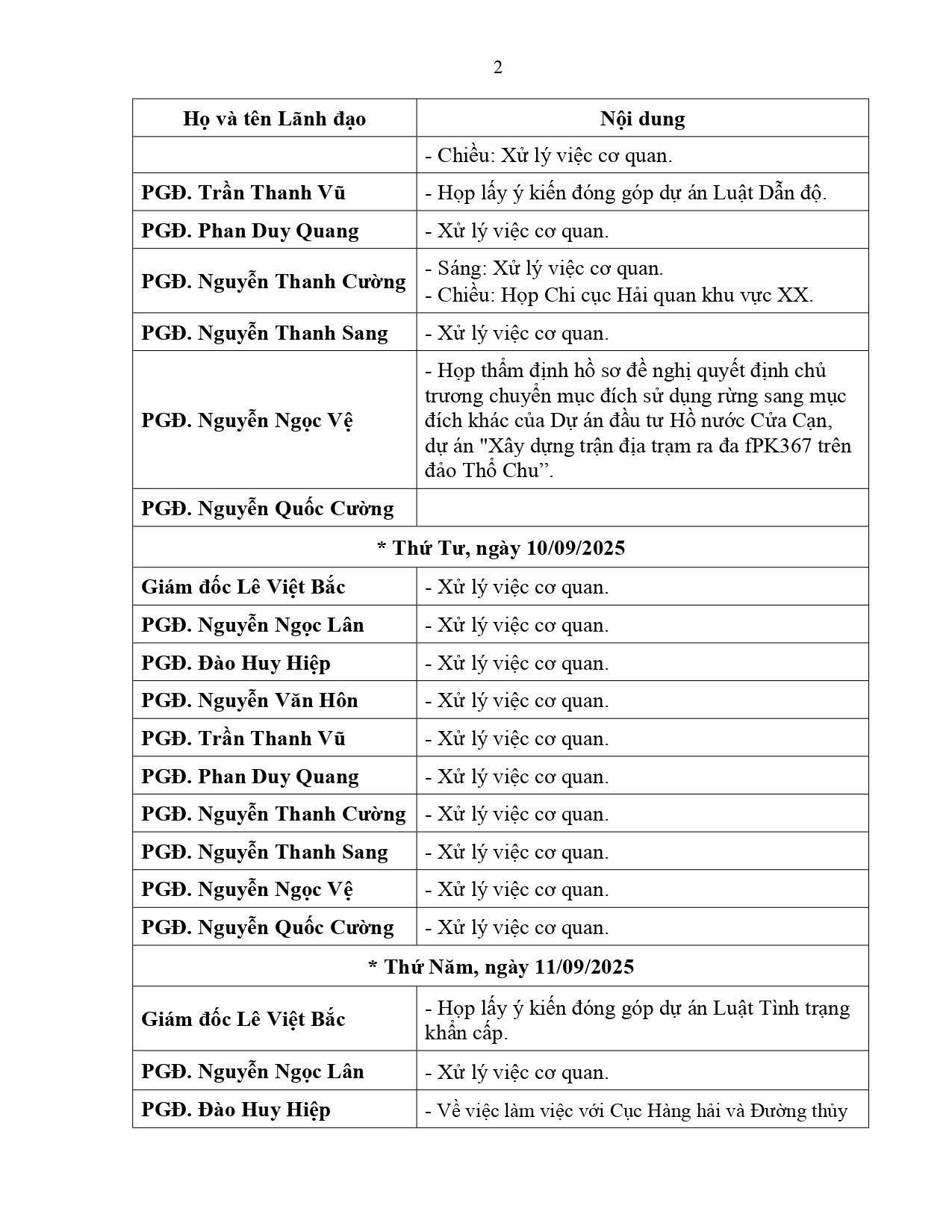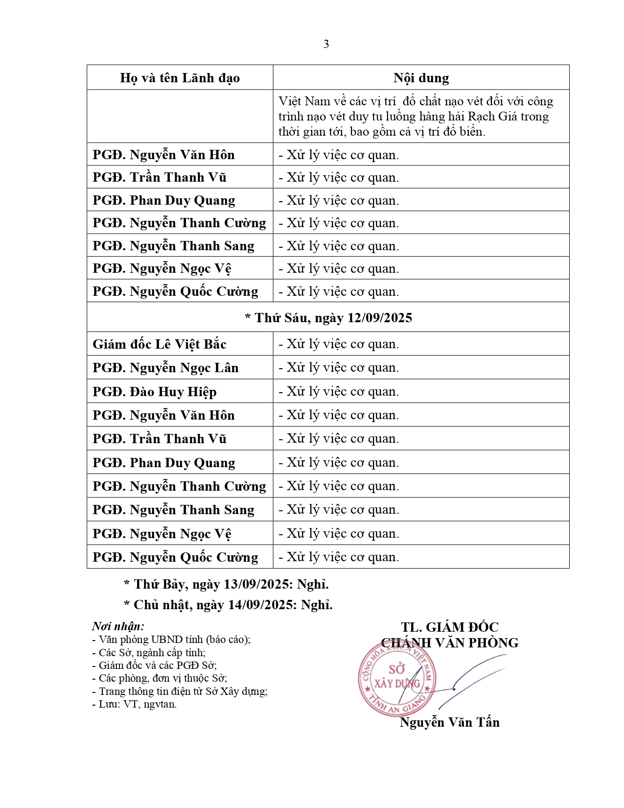 Lịch làm việc của Lãnh đạo Sở Xây dựng tỉnh An Giang (từ ngày 08/9/2025 đến ngày 14/9/2025)