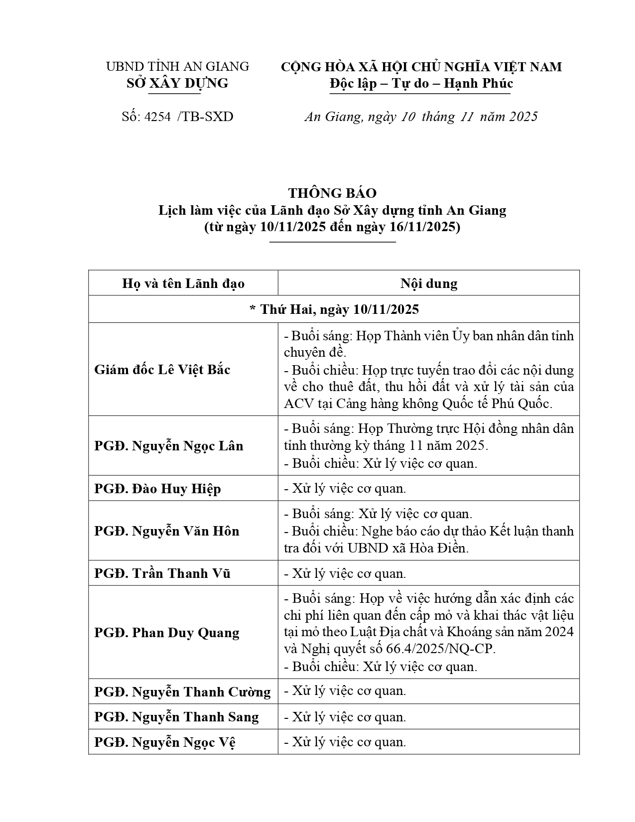 Thông báo số 4254/TB-SXD ngày 10/11/2025 của Sở Xây dựng tỉnh An Giang lịch làm việc của Lãnh đạo Sở Xây dựng tỉnh An Giang (từ ngày 10/11/2025 đến ngày 16/11/2025).