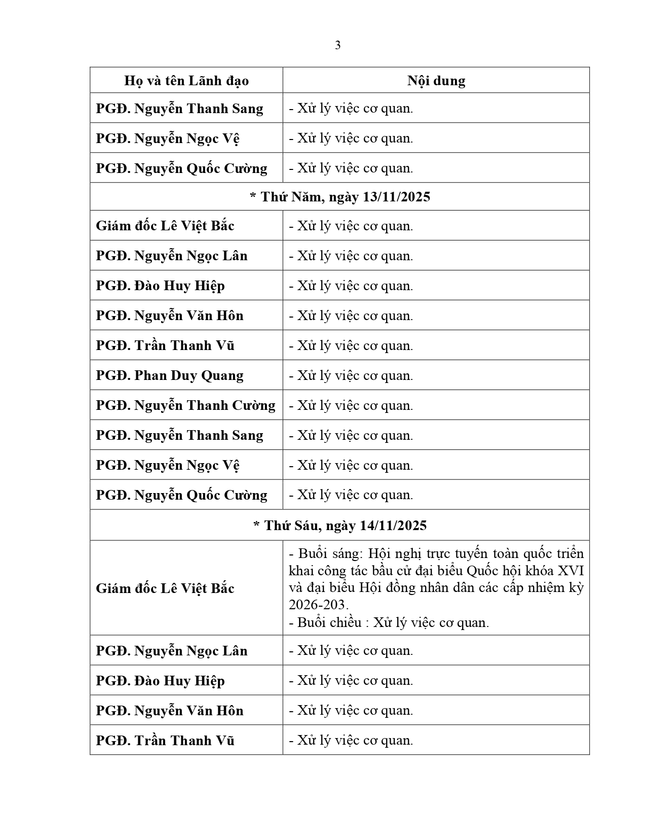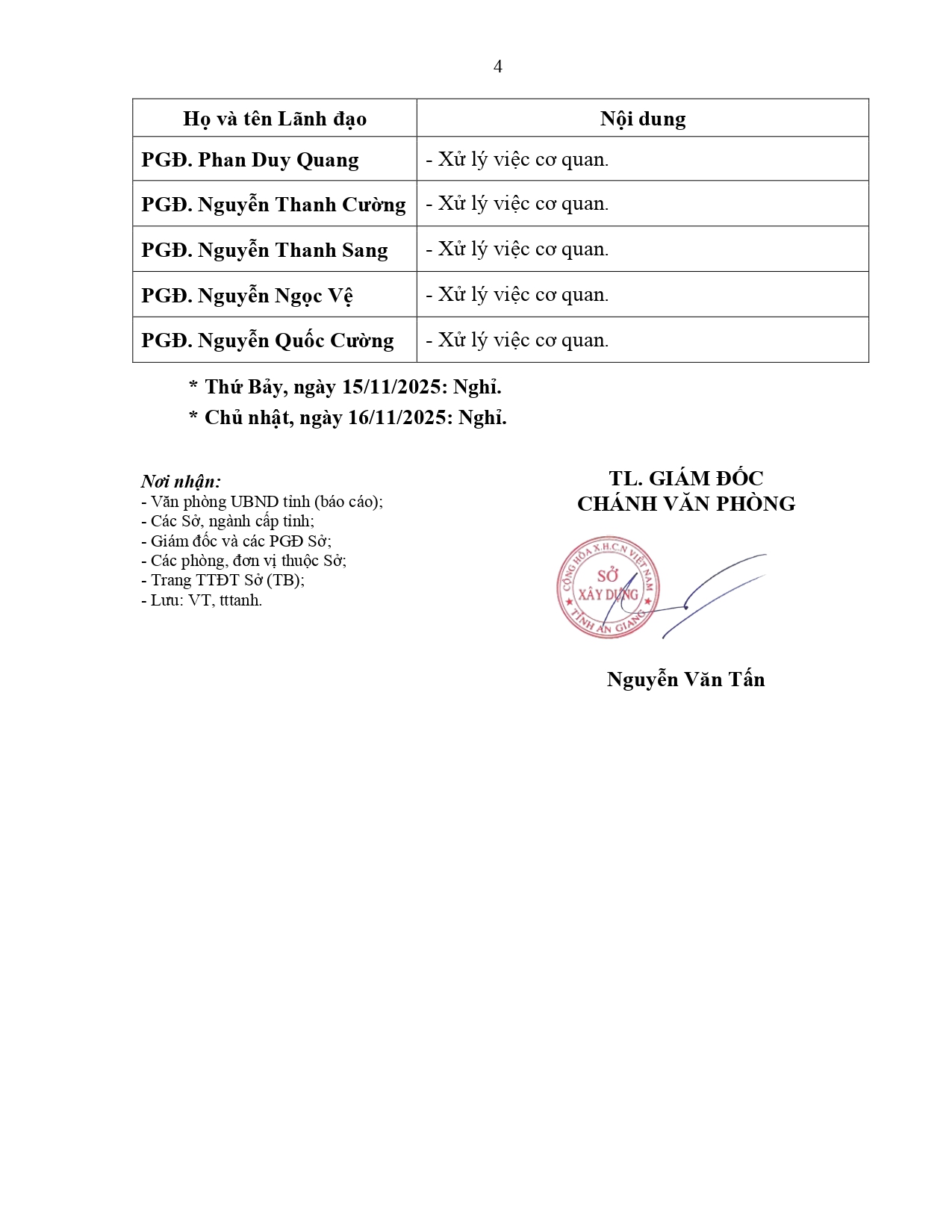Lịch làm việc của Lãnh đạo Sở Xây dựng tỉnh An Giang, từ ngày 10/11/2025 đến ngày 16/11/2025