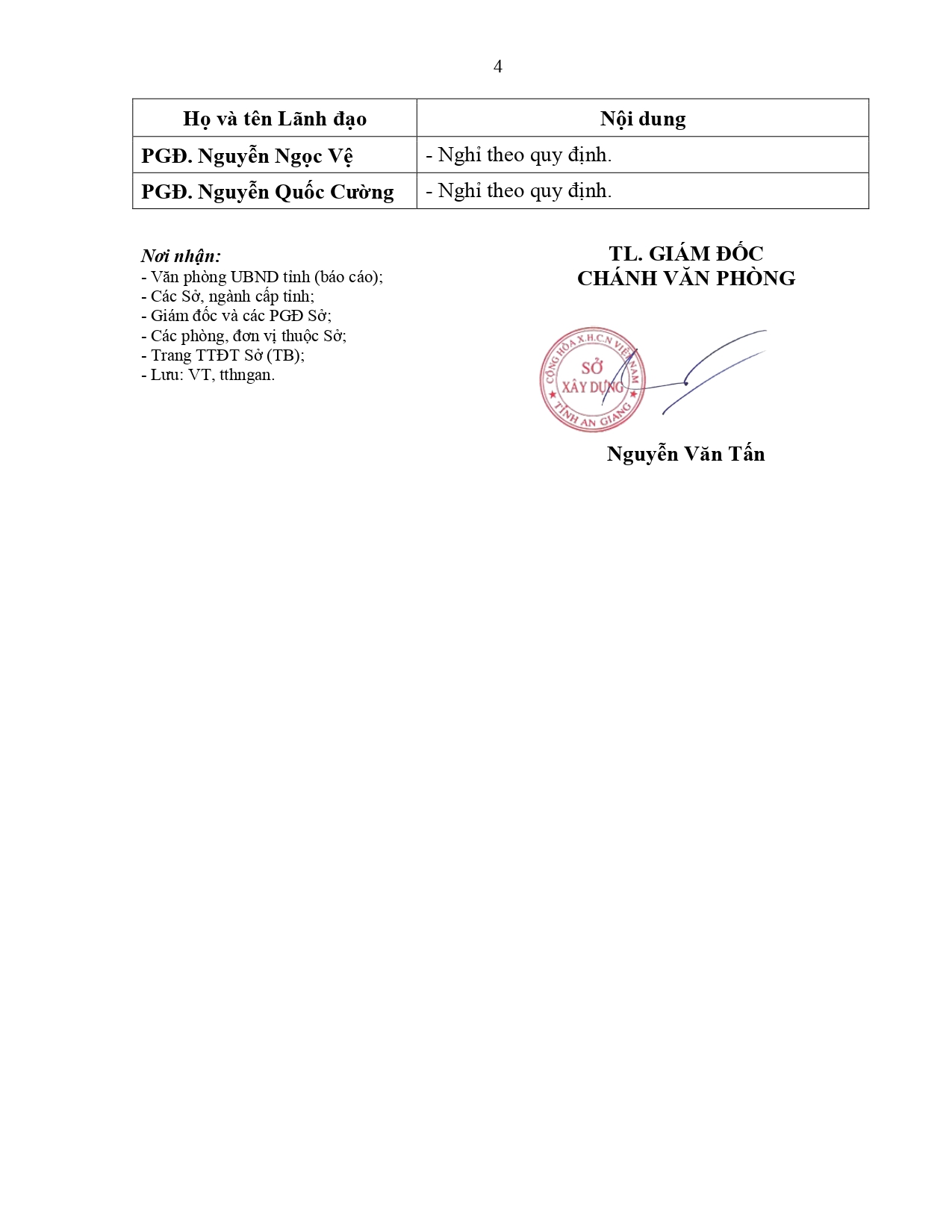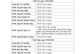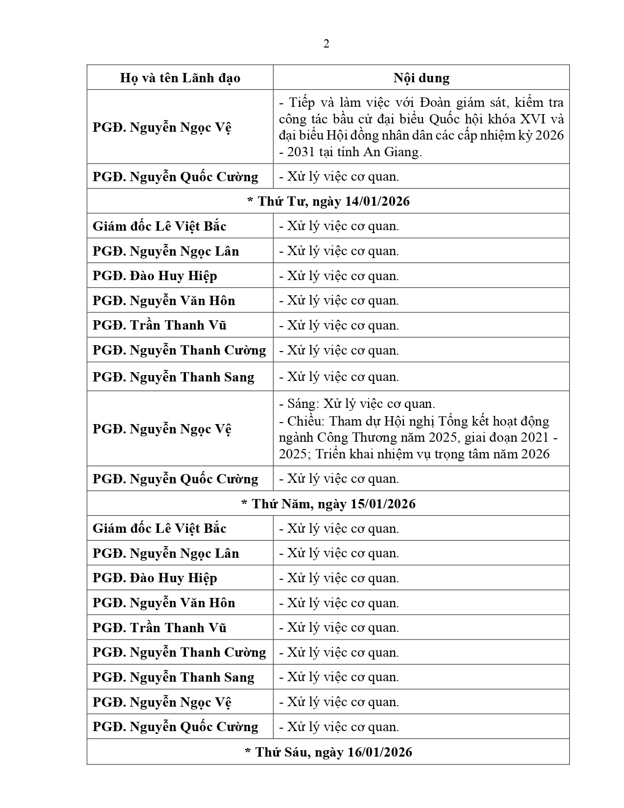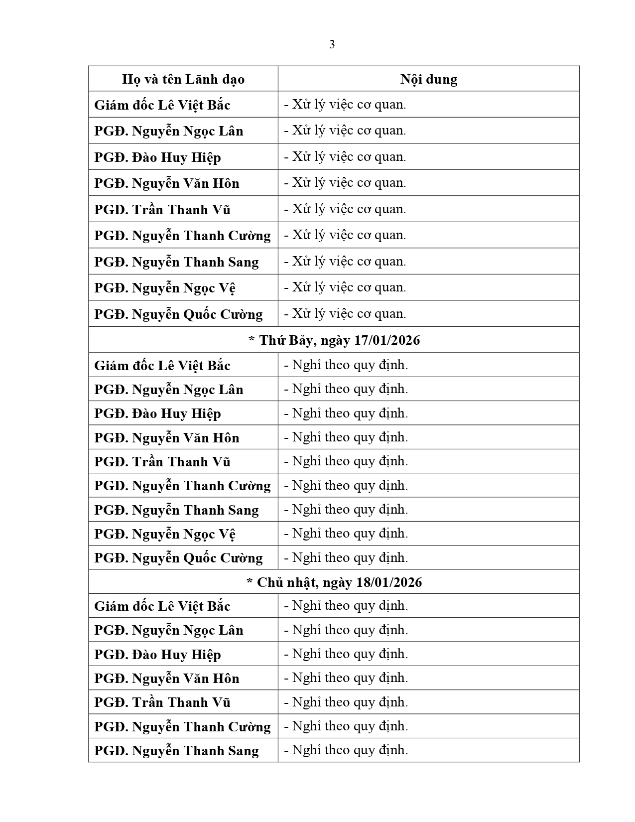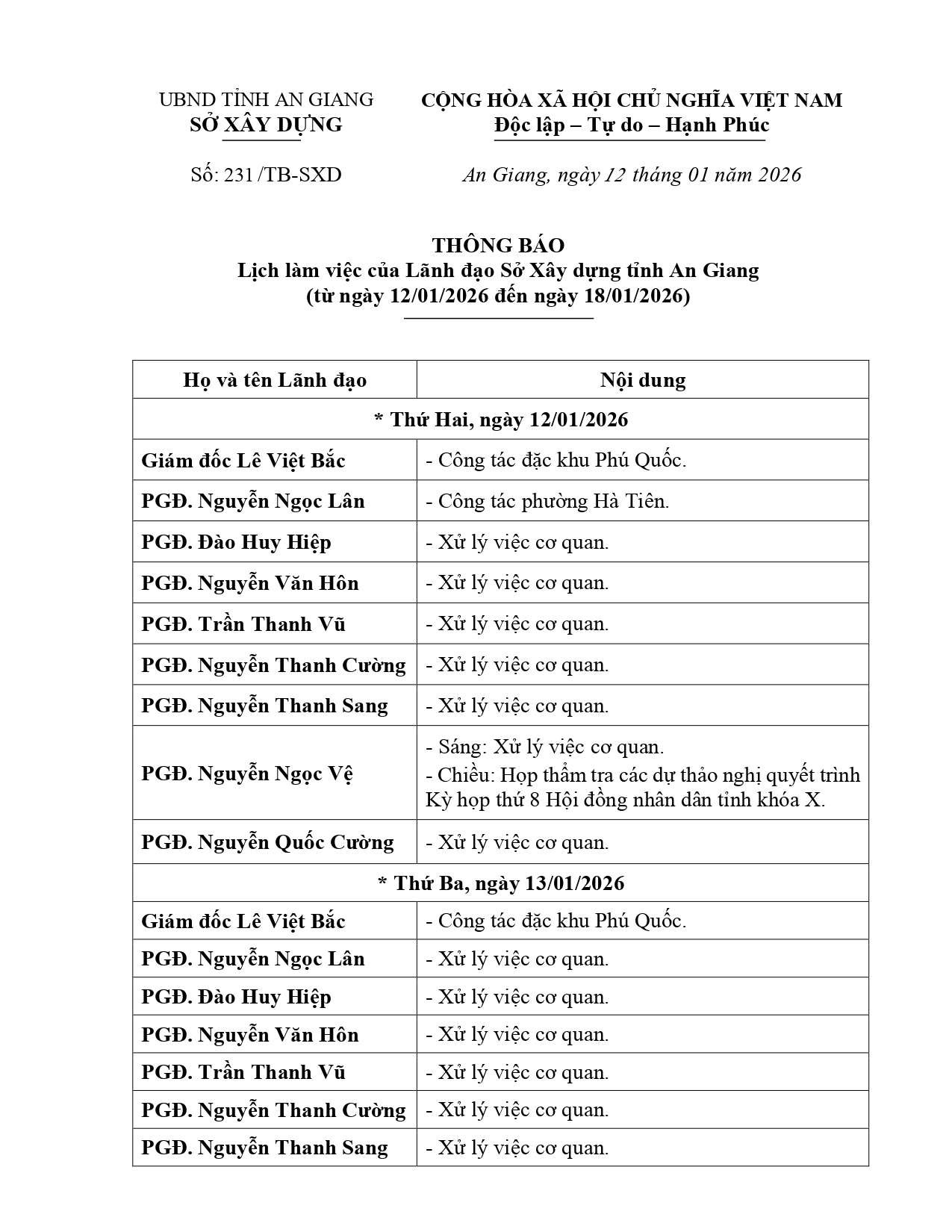 Thông báo số 231/TB-SXD ngày 12/01/2026 của Sở Xây dựng tỉnh An Giang lịch làm việc của Lãnh đạo Sở Xây dựng tỉnh An Giang (từ ngày 12/01/2026 đến ngày 18/01/2026).