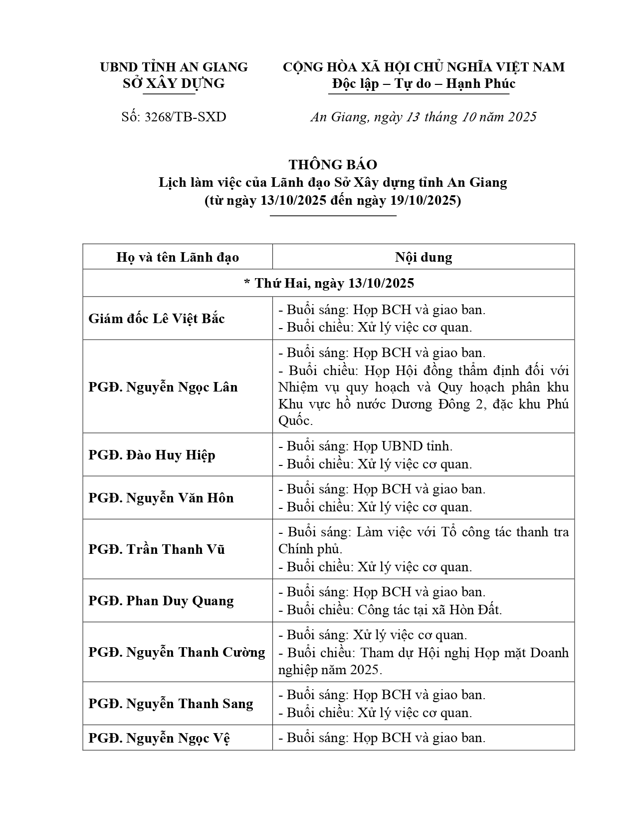 Thông báo số 3268/TB-SXD ngày 13/10/2025 của Sở Xây dựng tỉnh An Giang lịch làm việc của Lãnh đạo Sở Xây dựng tỉnh An Giang (từ ngày 13/10/2025 đến ngày 19/10/2025).