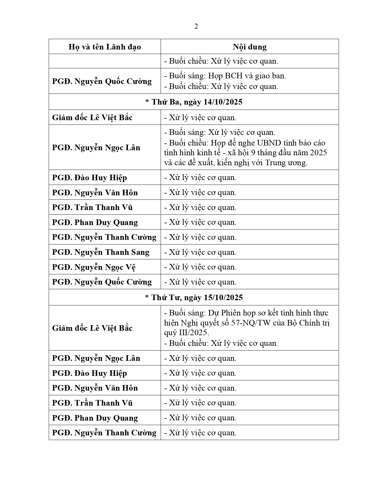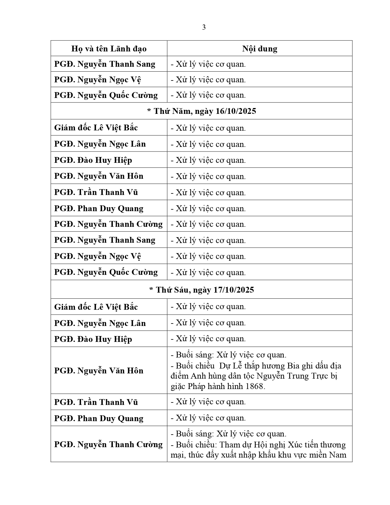 Lịch làm việc của Lãnh đạo Sở Xây dựng tỉnh An Giang, từ ngày 13/10/2025 đến ngày 19/10/2025