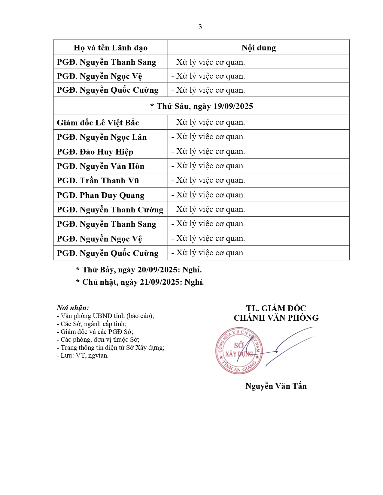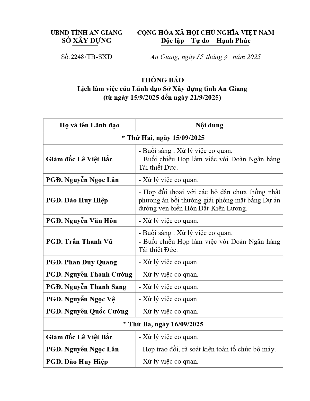 Lịch làm việc của Lãnh đạo Sở Xây dựng tỉnh An Giang (từ ngày 15/9/2025 đến ngày 21/9/2025)