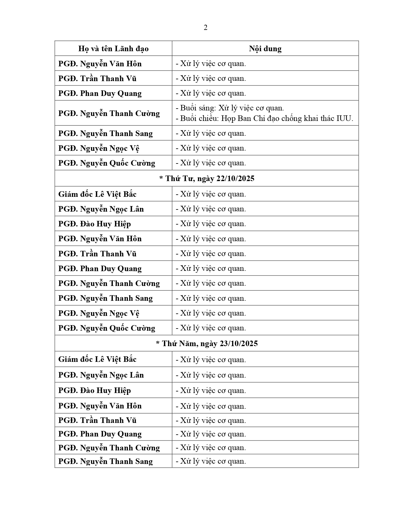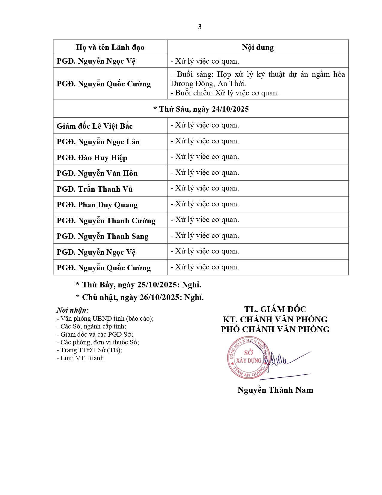 Lịch làm việc của Lãnh đạo Sở Xây dựng tỉnh An Giang, từ ngày 20/10/2025 đến ngày 26/10/2025