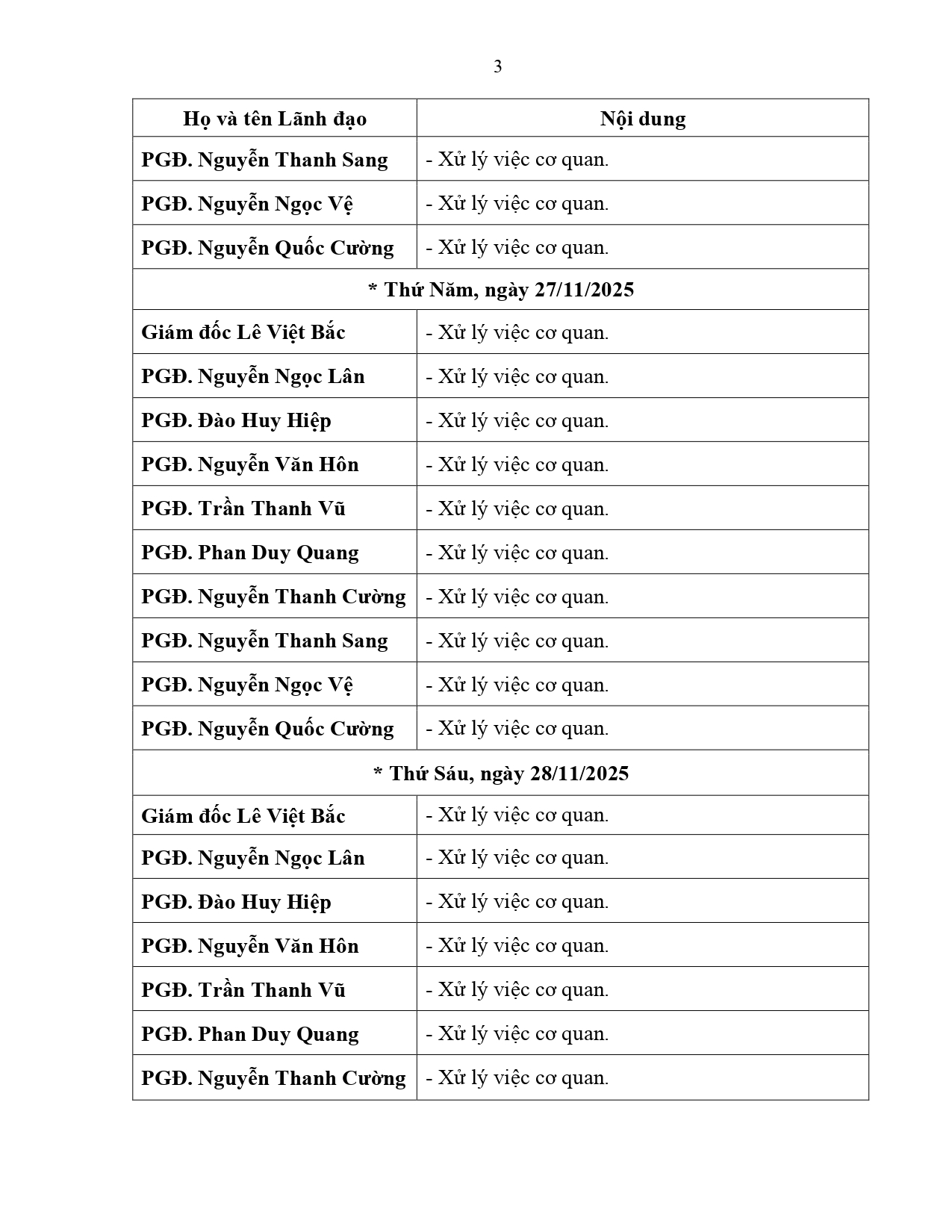 Lịch làm việc của Lãnh đạo Sở Xây dựng tỉnh An Giang, từ ngày 24/11/2025 đến ngày 30/11/2025