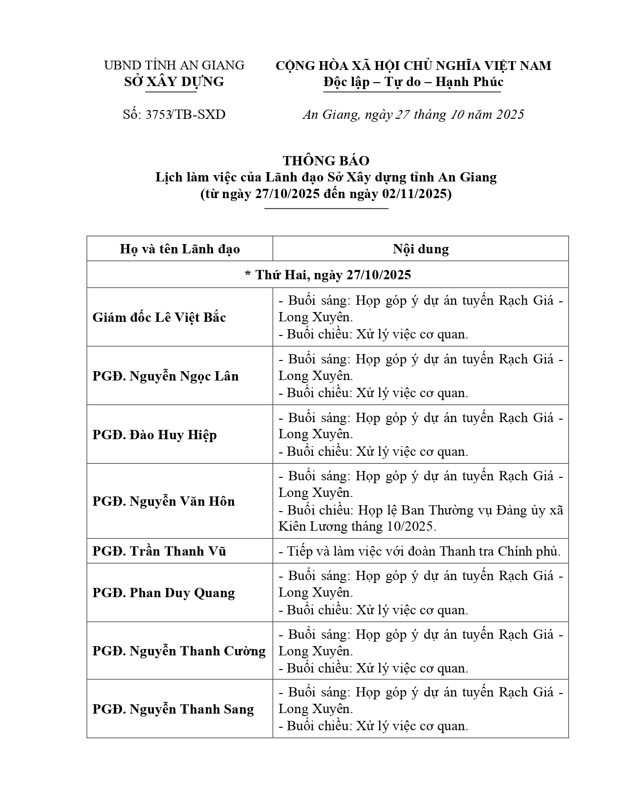 Thông báo số 3753/TB-SXD ngày 27/10/2025 của Sở Xây dựng tỉnh An Giang lịch làm việc của Lãnh đạo Sở Xây dựng tỉnh An Giang (từ ngày 27/10/2025 đến ngày 02/11/2025).