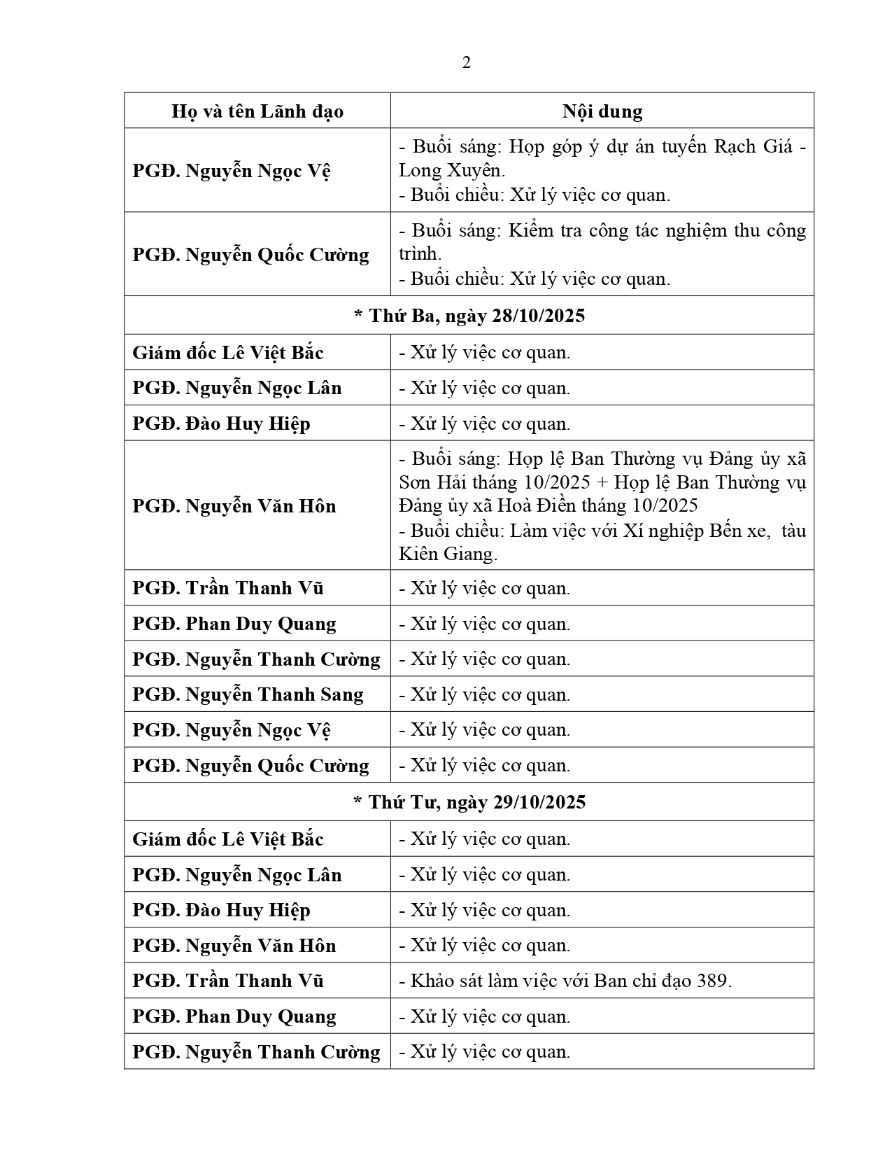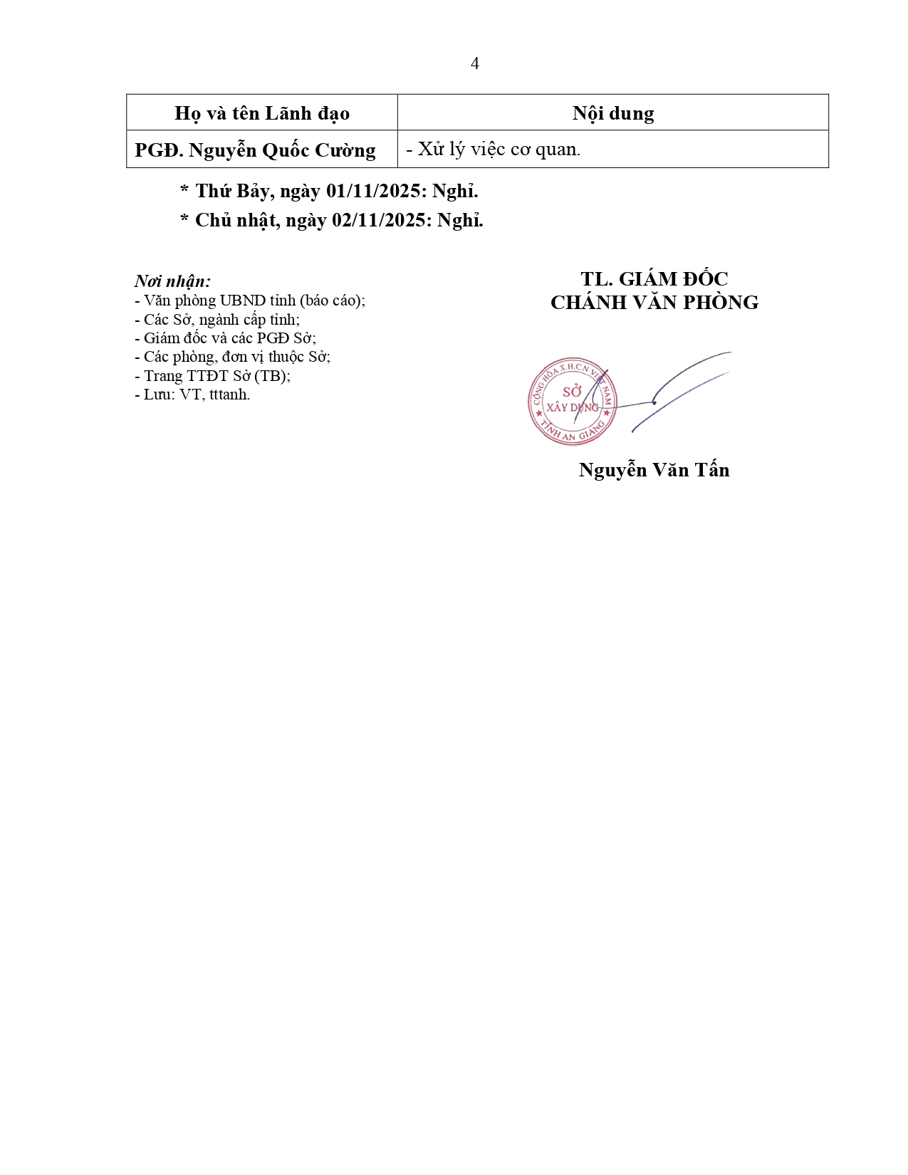 Lịch làm việc của Lãnh đạo Sở Xây dựng tỉnh An Giang, từ ngày 27/10/2025 đến ngày 02/11/2025