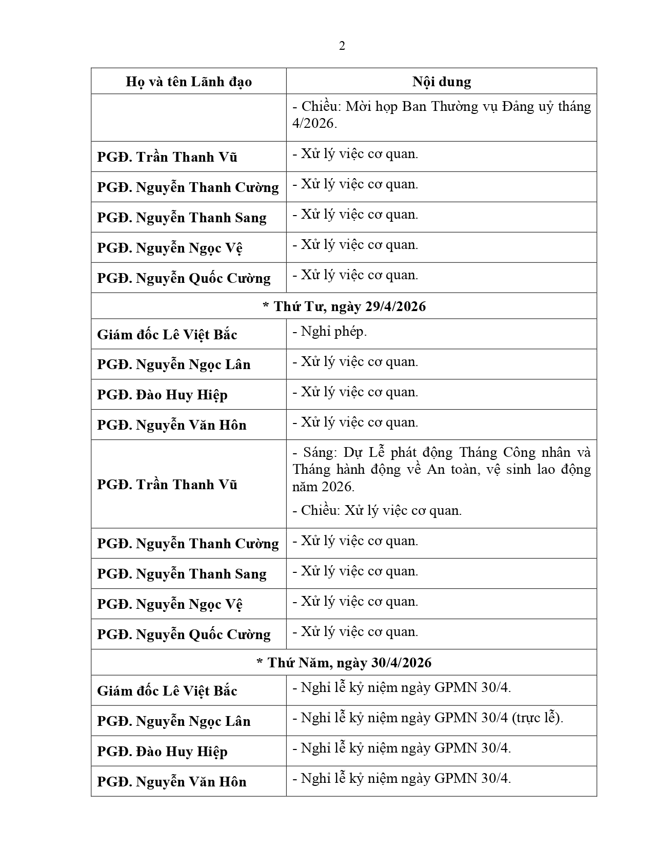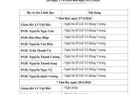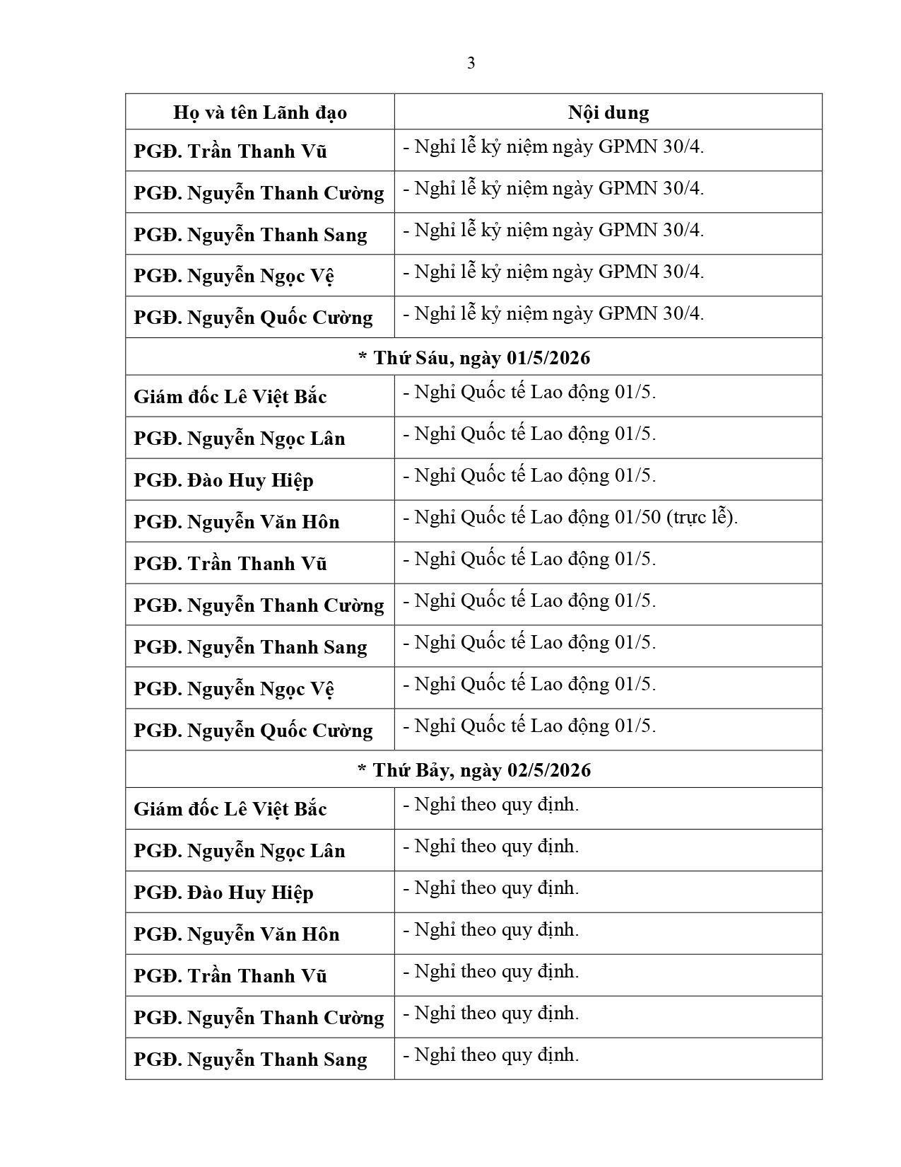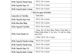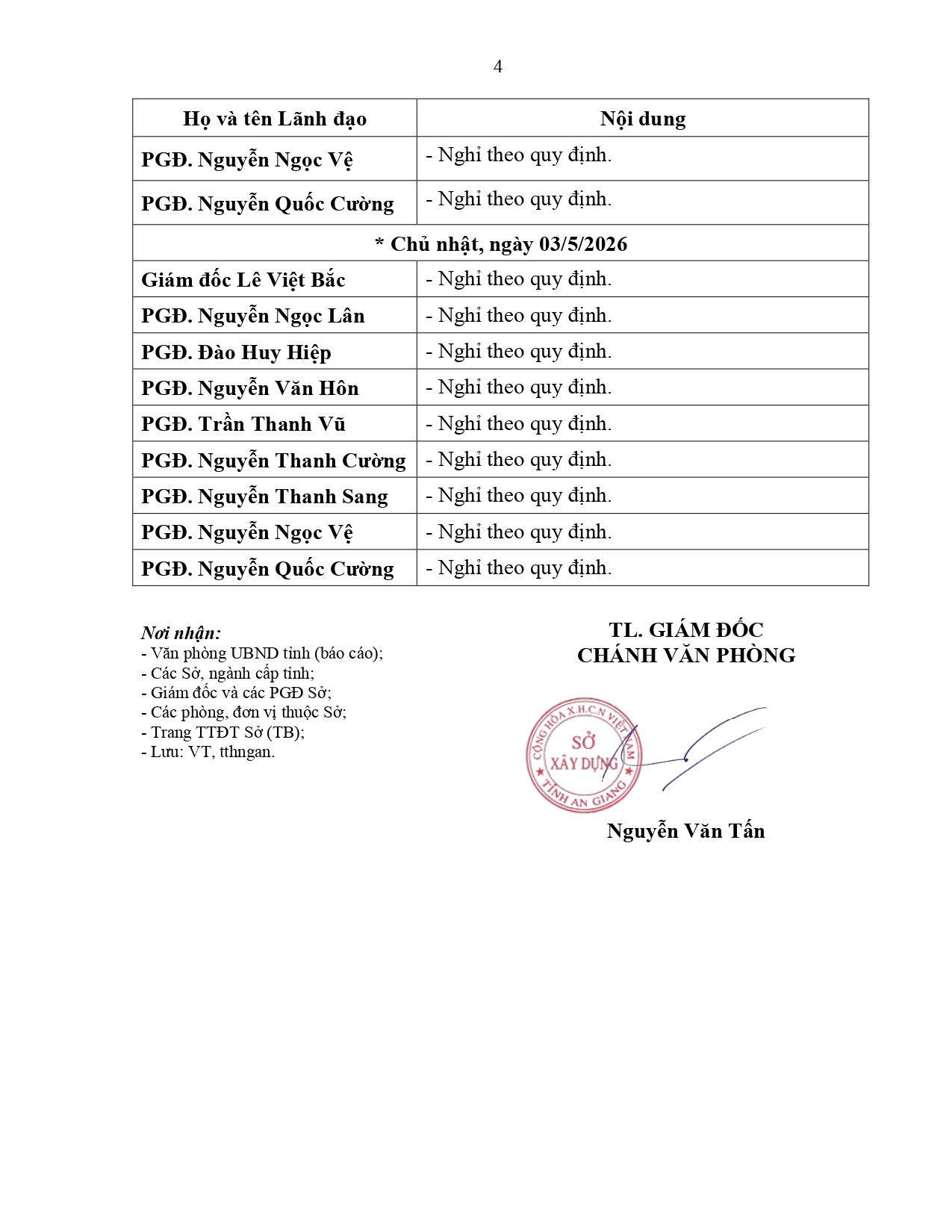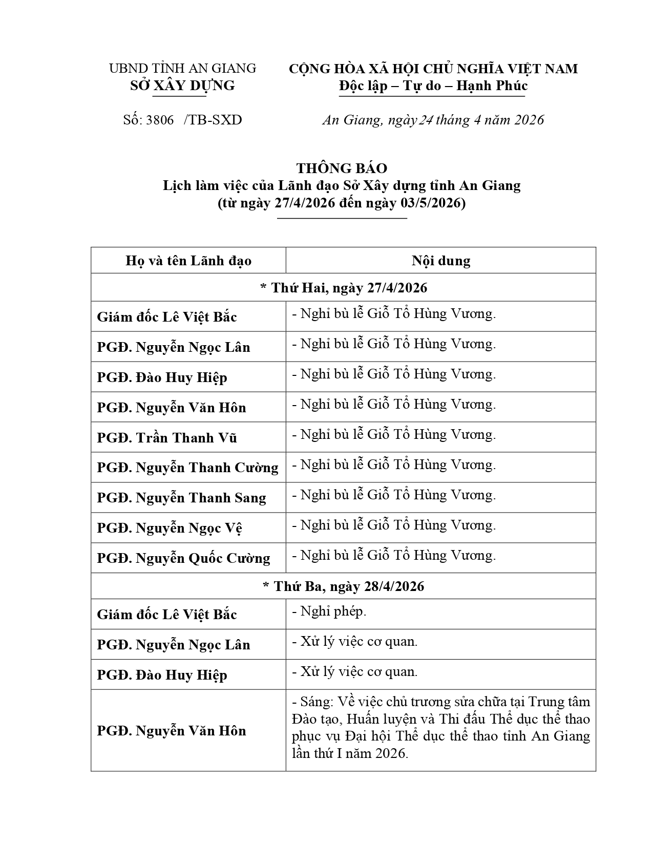 Thông báo số 3806/TB-SXD ngày 24/4/2026 của Sở Xây dựng tỉnh An Giang lịch làm việc của Lãnh đạo Sở Xây dựng tỉnh An Giang (từ ngày 27/4/2026 đến ngày 03/5/2026).