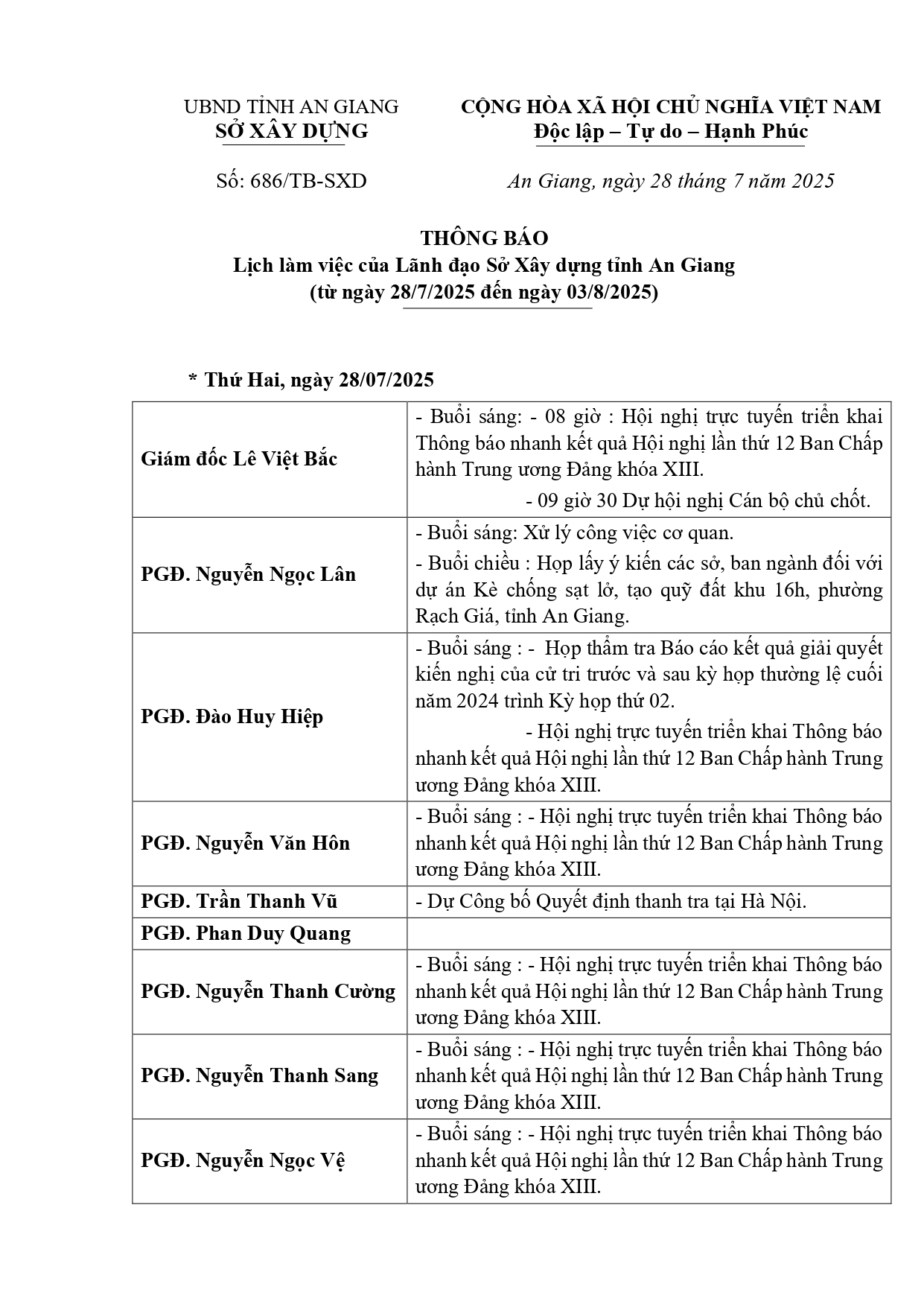 Thông báo số 686/TB-SXD ngày 28/7/2025 của Sở Xây dựng tỉnh An Giang lịch làm việc của Lãnh đạo Sở Xây dựng tỉnh An Giang (từ ngày 28/7/2025 đến ngày 03/8/2025).