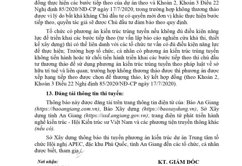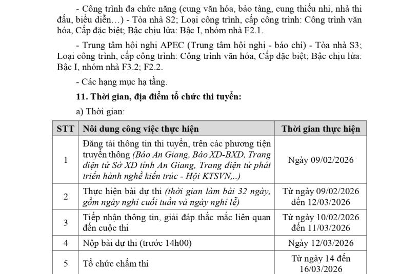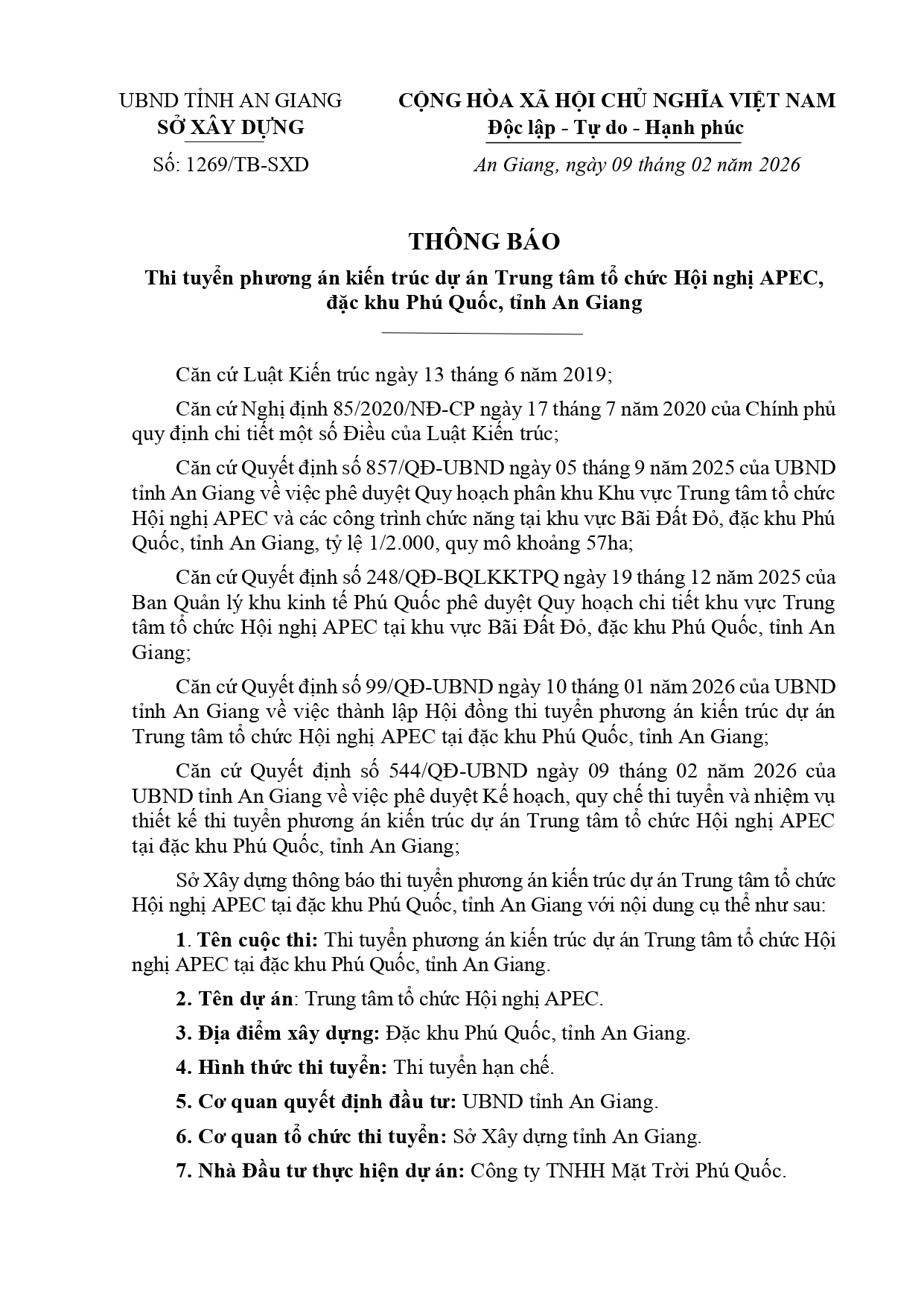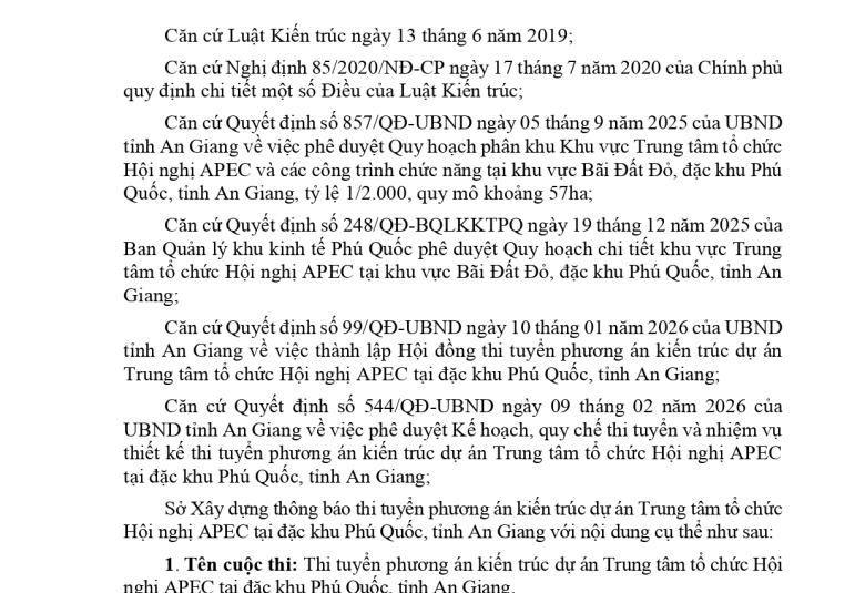 Ngày 09/02/2026, Sở Xây dựng tỉnh An Giang ban hành Thông báo số 1269/TB-SXD ngày Thi tuyển phương án kiến trúc dự án Trung tâm tổ chức Hội nghị APEC, đặc khu Phú Quốc, tỉnh An Giang.