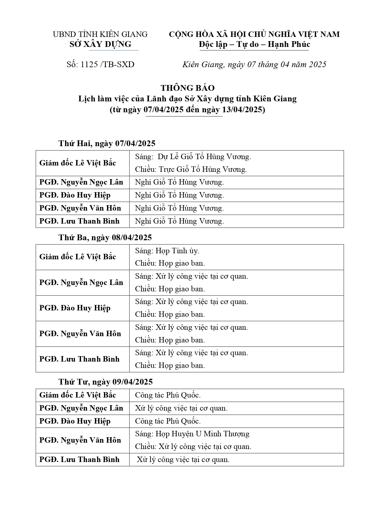 Sở Xây dựng tỉnh Kiên Giang ban hành Thông báo số 1125/TB-SXD ngày 07/4/2025 lịch làm việc của Lãnh đạo Sở Xây dựng tỉnh Kiên Giang (từ ngày 07/04/2025 đến ngày 13/04/2025).