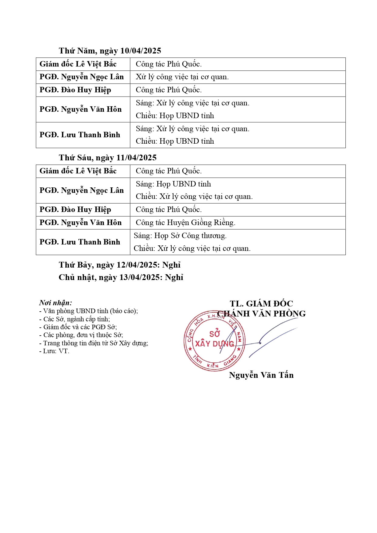 Thông báo lịch làm việc của Lãnh đạo Sở Xây dựng tỉnh Kiên Giang (từ ngày 07/04/2025 đến ngày 13/04/2025)